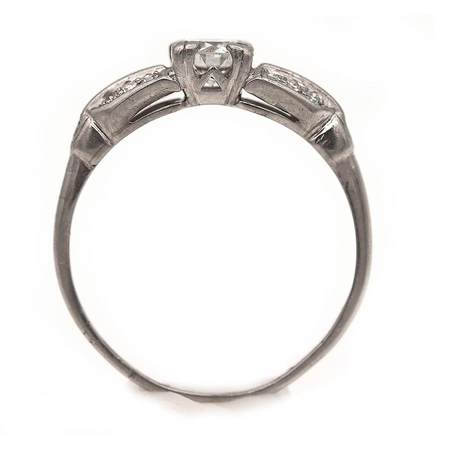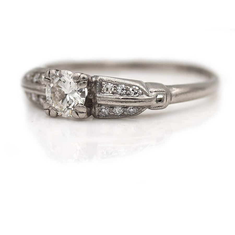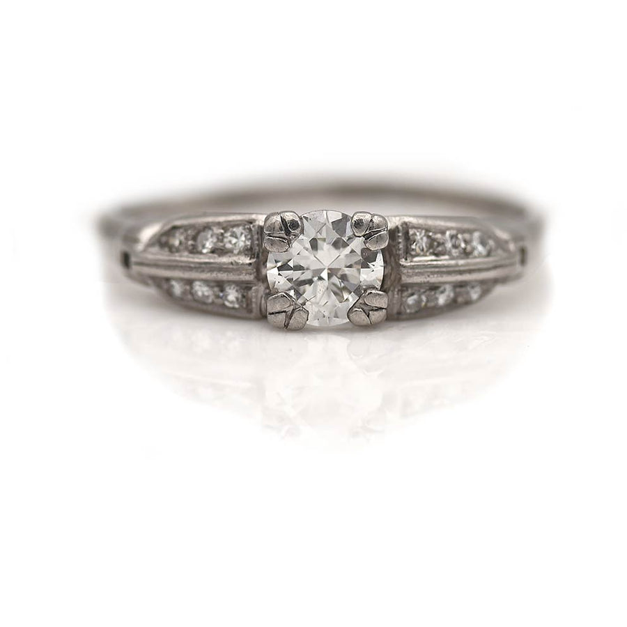 The Cammie ring is an authentic Art Deco engagement ring, circa 1930s, featuring a bright-white .50 carat transitional cut diamond of H color, VS2 clarity, residing within trefoil prongs. This diamond is flanked by 12 single cut diamond accents, all beautifully crafted in platinum. A wonderfully vibrant, classic diamond ring in very good condition.