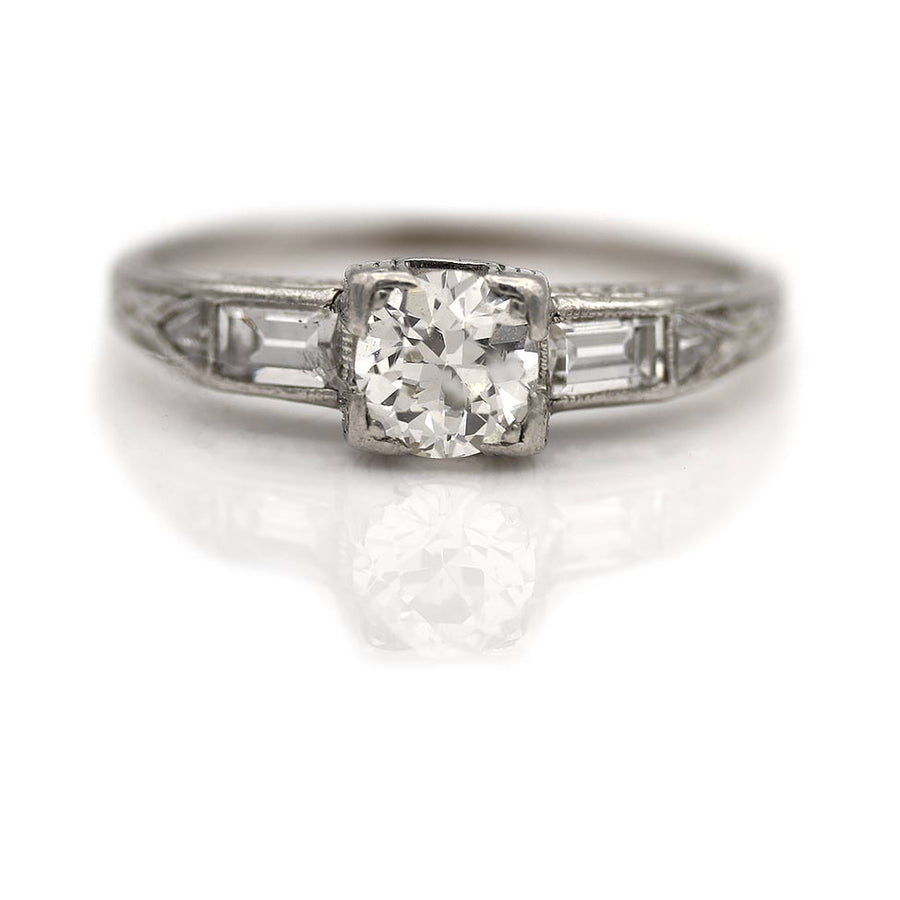 The Jude ring is an authentic vintage engagement ring from the Art Deco era circa 1930's. The ring features a dazzling .50 carat AGI certified old European cut diamond residing in a square frame. The diamond is flanked by 2 straight baguette diamond and 2 kite shape diamond accents. Crafted in platinum, accentuated with intricate filigree engravings. A bold, timeless vintage ring. In very good condition.