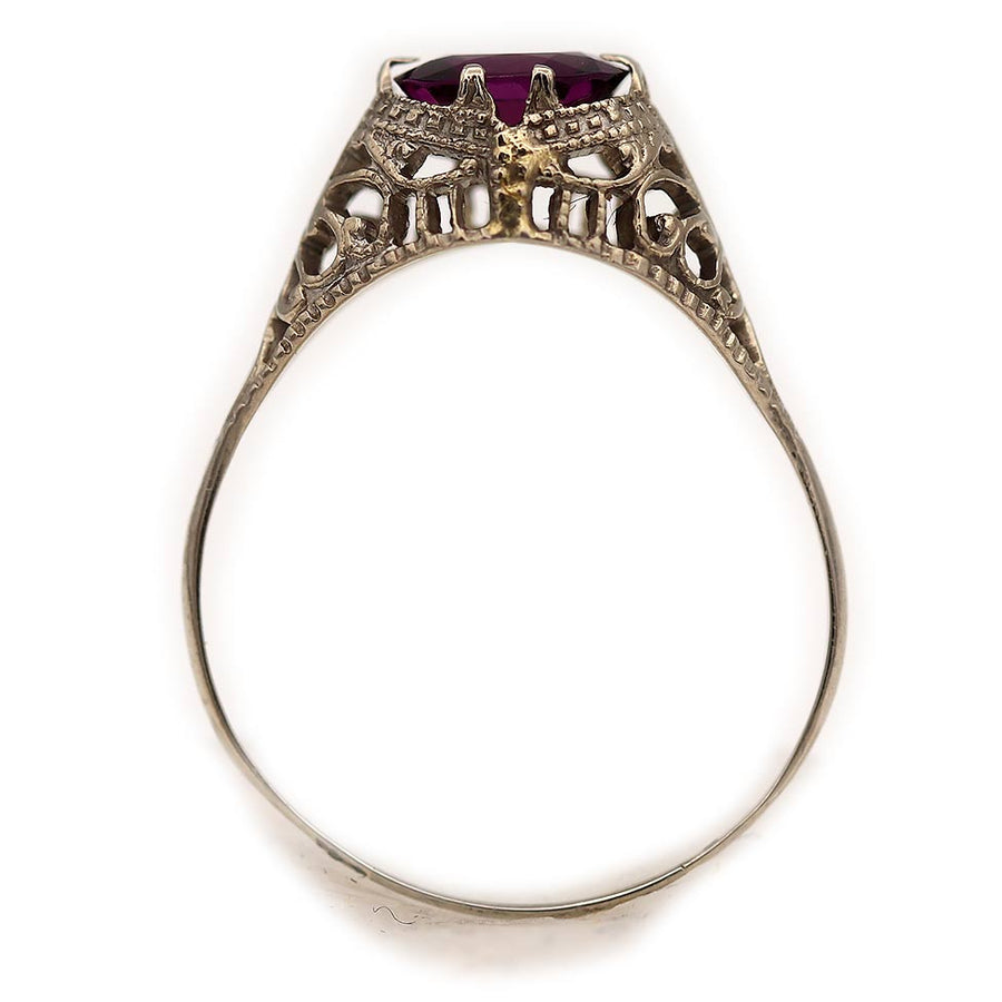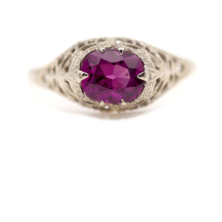 The Dennis ring is an authentic vintage gemstone engagement ring from the Art Deco era, circa 1930s. This ring features a natural .90 carat East-West set intense purple cushion cut garnet, beautifully crafted in 14 kt white gold, accentuated with delicate milgrain engravings and open metal work. A sweet gemstone engagement ring, in very good condition.