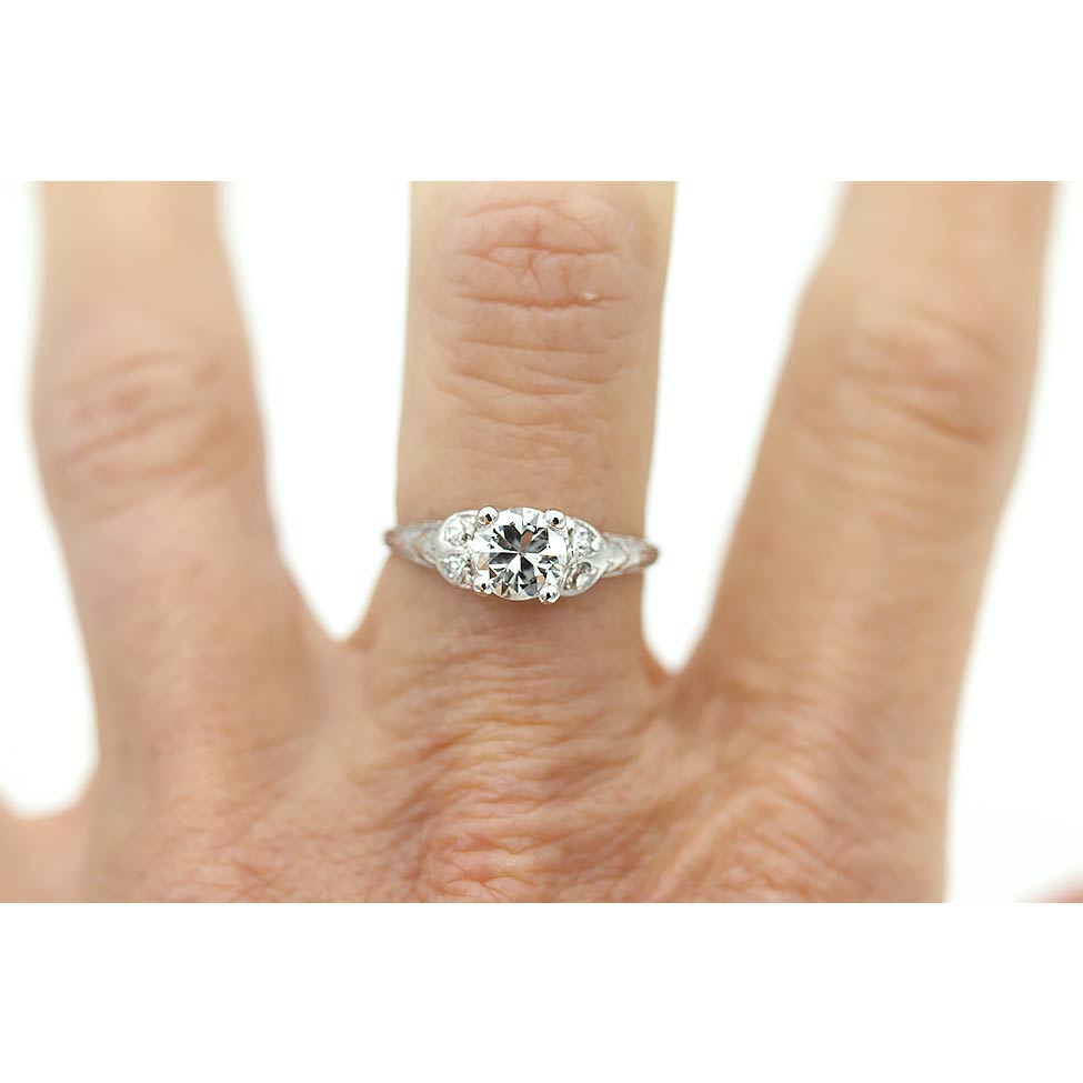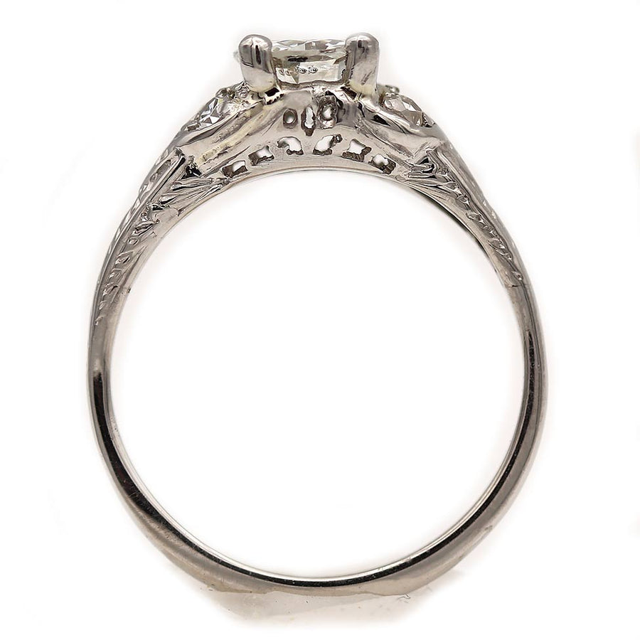 The Fulton ring is an authentic vintage engagement ring from the Art Deco era, crafted in the 1930s. It showcases a stunning .70 carat GIA-certified old European cut diamond, graded I color and SI2 clarity, ensuring a beautiful sparkle. This classic piece is set in 14k white gold and features intricate filigree engravings, embodying the timeless elegance of the Art Deco period. Four single-cut diamond accents add to its charm, making it a truly unique and eye-catching ring. In very good condition.