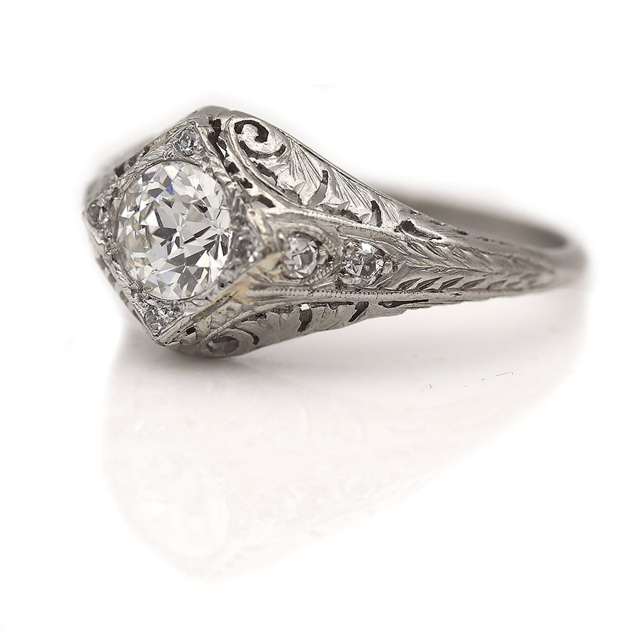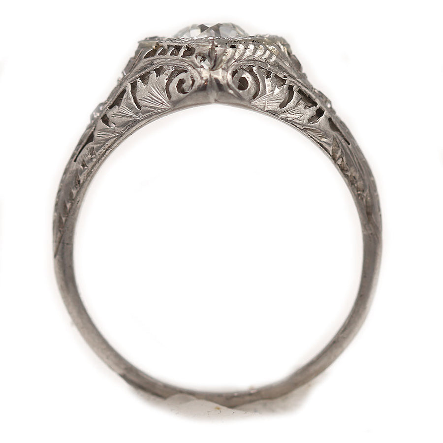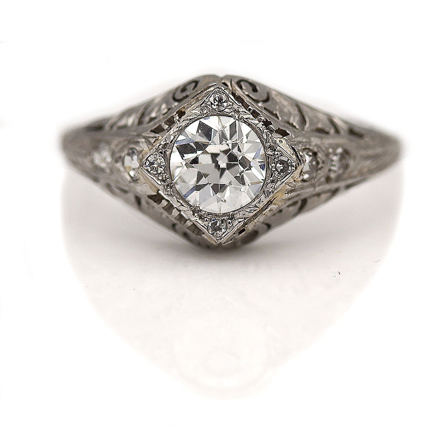 The Flavia ring is an authentic vintage diamond engagement ring from the Art Deco era circa 1930s. The ring features a GIA certified .77 carat old European cut diamond of G color, VS2 clarity, residing in a geometric 4-sided frame. The diamond is surrounded by 8 single cut diamond accents. Crafted in platinum, accentuated with swirling metal work and intricate filigree engravings. A rare, one of a kind vintage piece! In excellent condition.