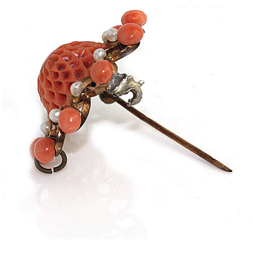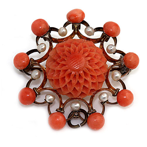 This coral pin, or pendant, has a twisted center coral which is surrounded by 9 pearls and 9 round corals, all sitting in a 14 kt rose gold setting. This piece measures just shy of 1 1/8" wide by 1 1/8" long. $2,500.00