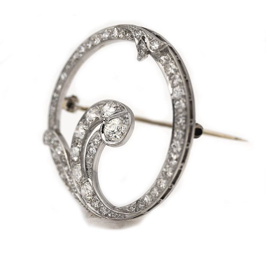 Natash is an exquisite, original Art Deco diamond brooch featuring 54 glittering old mine and single cut diamonds, weighing approximately 3.50 carats of G color and SI1 clarity. Beautifully crafted in the 1930's in platinum, this pin is completed with milgrain engravings. A true Art Deco beauty, in very good condition.