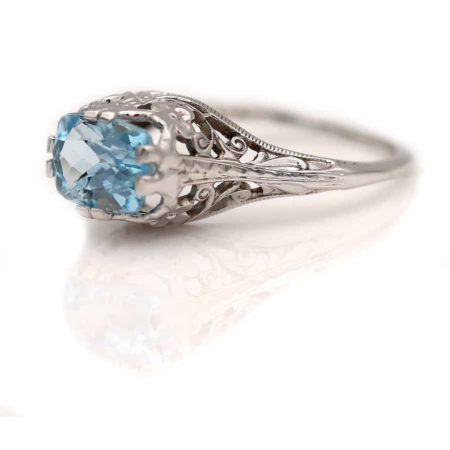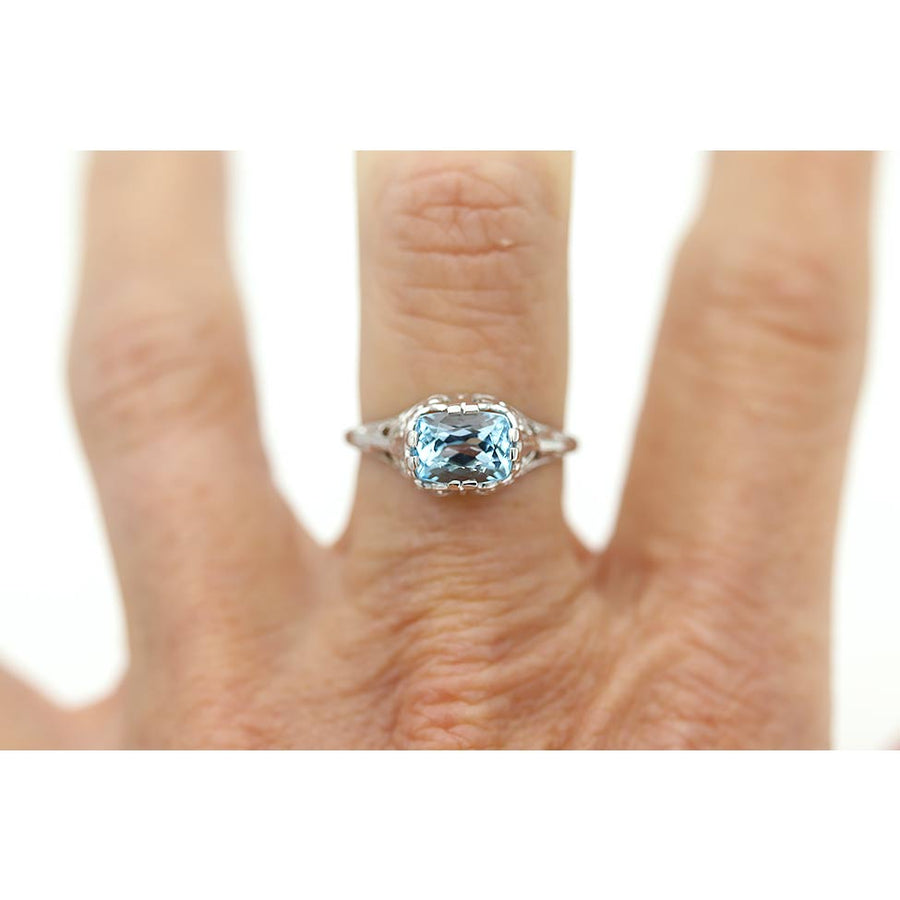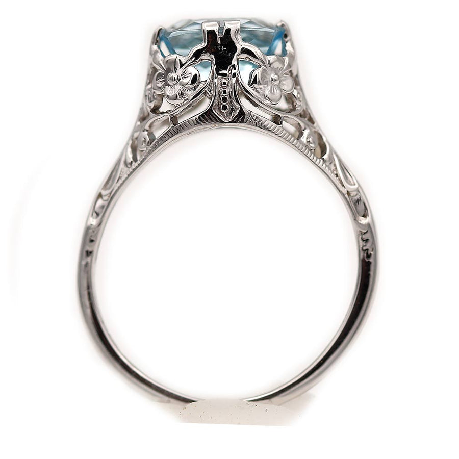 The Rigby ring is an authentic vintage gemstone ring from the Art Deco era, circa 1930s, featuring a natural sky blue east-west 1.00 carat emerald cut aquamarine. Crafted in 14 kt white gold and accentuated with gorgeous open metal work, delicate filigree and floral engravings. Clean, crisp and and in very good condition. The perfect alternative engagement ring.