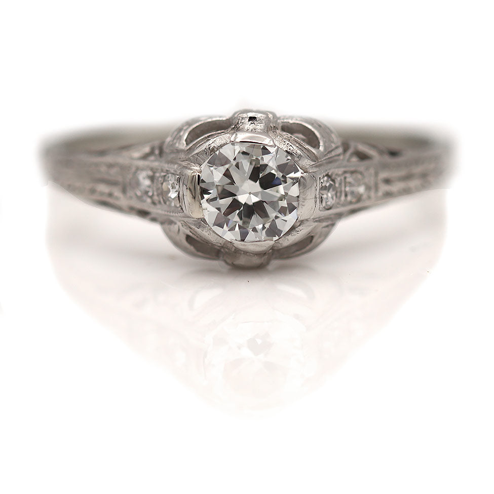 The Kander ring is an authentic vintage diamond engagement ring from the Art Deco era, circa 1930's. This ring showcases glittering .57 carat old European cut diamond of I color and VS1 clarity, surrounded by four (4) old mine and single cut diamond accents. Crafted in platinum and 18 kt white gold, this ring is accentuated with delicate milgrain engravings and open metal work. A lovely vintage piece, in good condition.