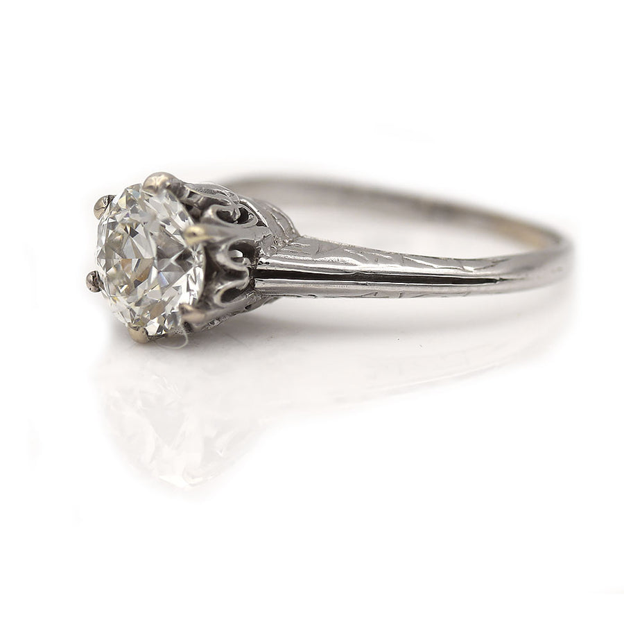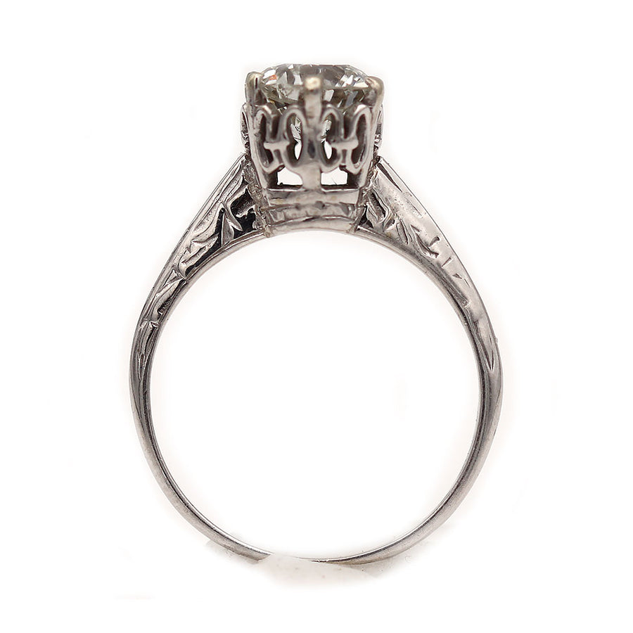 The Fiddler ring is an authentic vintage diamond engagement ring from the Art Deco era, circa 1930s. This ring boasts a GIA certified 1.16 carat old European cut diamond of K color and I1 clarity The diamond stands tall and proud in a platinum setting, accentuated with open metal work and intricate filigree engravings. A bold vintage piece which is perfect to wear on either hand. In very good condition.