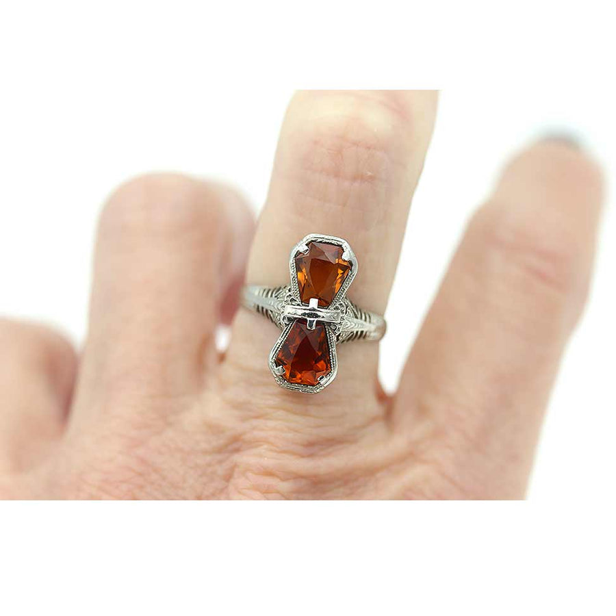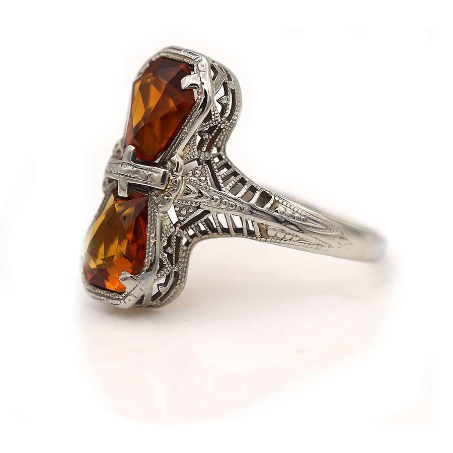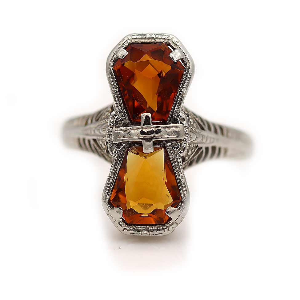 The Hupfeld ring is an authentic Art Deco two stone engagement ring, circa 1930s, featuring two (2) North-South set natural, intense orange brown kite shape citrines weighing approximately 2.00 carat. Beautifully crafted in 14 kt white gold, and accentuated with open metal work and filigree engravings, this ring is as lovely as can be. In very good condition.