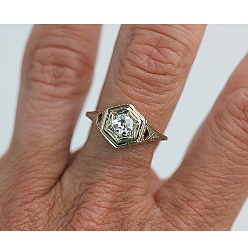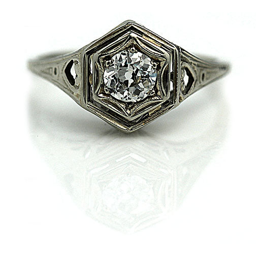 The Story ring is an authentic Art Nouveau engagement ring circa 1910. The ring features a glittering .30 carat old mine cut diamond of F color, SI1 clarity, residing in a hexagonal frame. Crafted in 20 karat white gold, completed with open metal work and a heart motif. A delightful ring, in very good condition. Your partners heart will always belong to you!