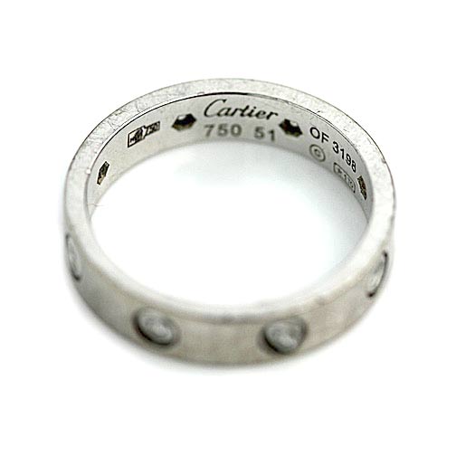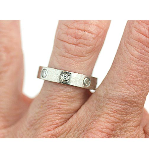 The Cartier Love Band is an authentic Vintage Cartier eternity band circa 1980's. The Love band features 8 bezel set round cut diamonds weighing approximately .25 carats of F color, VS1 clarity. Beautifully crafted in 18 karat white gold. A gorgeous vintage band signed and stamped "Cartier". In very good condition!