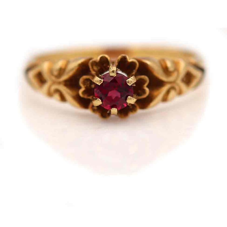 The Aimee ring is an authentic vintage garnet engagement ring, from the Victorian era circa 1900s. The ring features a .30 carat natural intense purple round cut garnet. Beautifully crafted in 14 kt rosy-yellow gold, and accentuated with delicate filigree engravings. As sweet and lovely as can be.