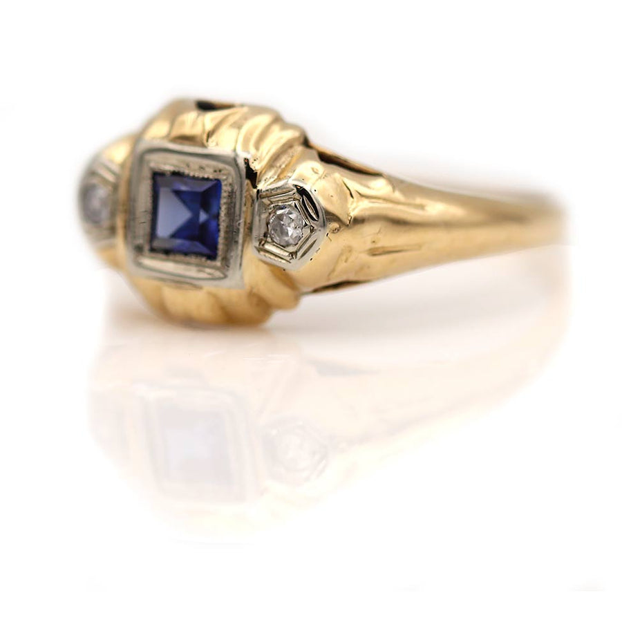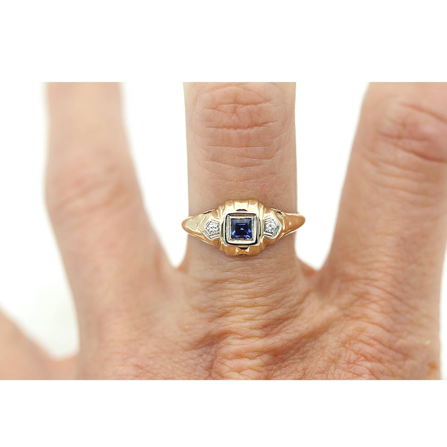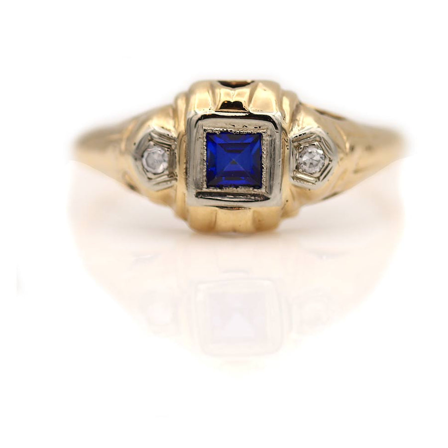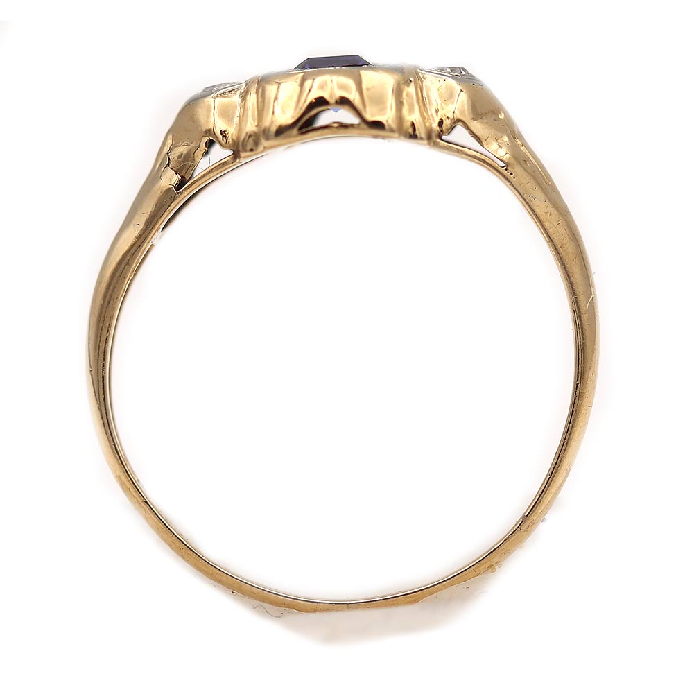 The Lulla ring is an authentic antique gemstone ring circa 1940'. This ring features a natural bezel set .25 square cut sapphire flanked by two (2) single cut diamond accents. Beautifully crafted in 10 kt rosy-yellow gold, and accentuated with delicate filigree engravings, this is perfect to wear on either hand. In very good condition.