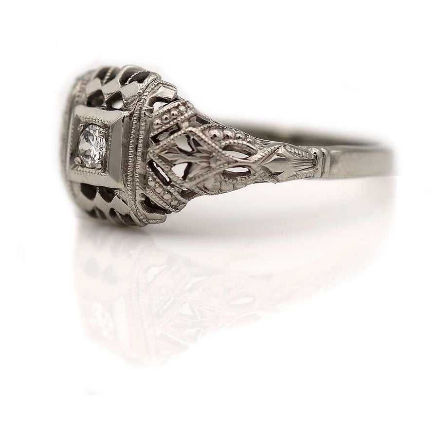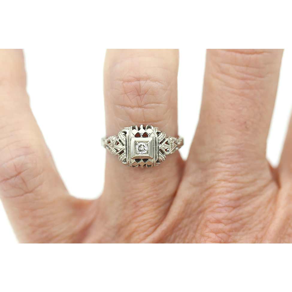 The Warren ring is an authentic vintage engagement ring from the Art Deco era, circa 1930s. This ring showcases a .08 carat old mine cut diamond of H color and SI1 clarity, residing within a geometric square frame. Beautifully crafted in 18 kt white gold, and accentuated with open metal work and delicate milgrain and filigree engravings, this is a timeless vintage piece, in very good condition.