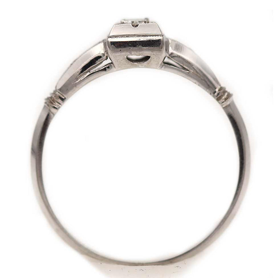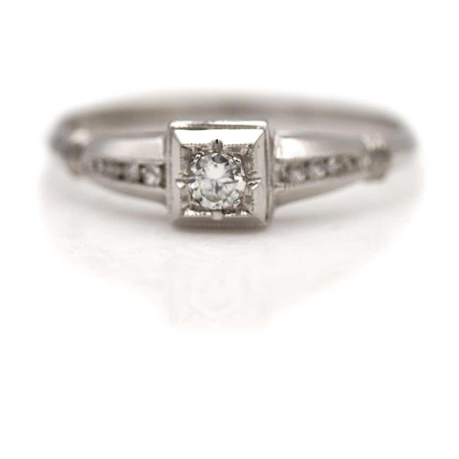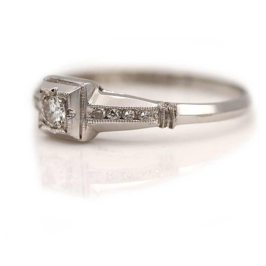 The Cole ring is an authentic vintage engagement ring from the Art Deco era, circa 1930's. This band features a bright-white .10 carat transitional cut diamond (F color and VS2 clarity), residing within a geometric square frame, and flanked by six (6) single cut diamond accents. Beautifully crafted in 18 kt white gold, accentuated with milgrain engravings, this ring is as delicate and lovely as can be. In very good condition.