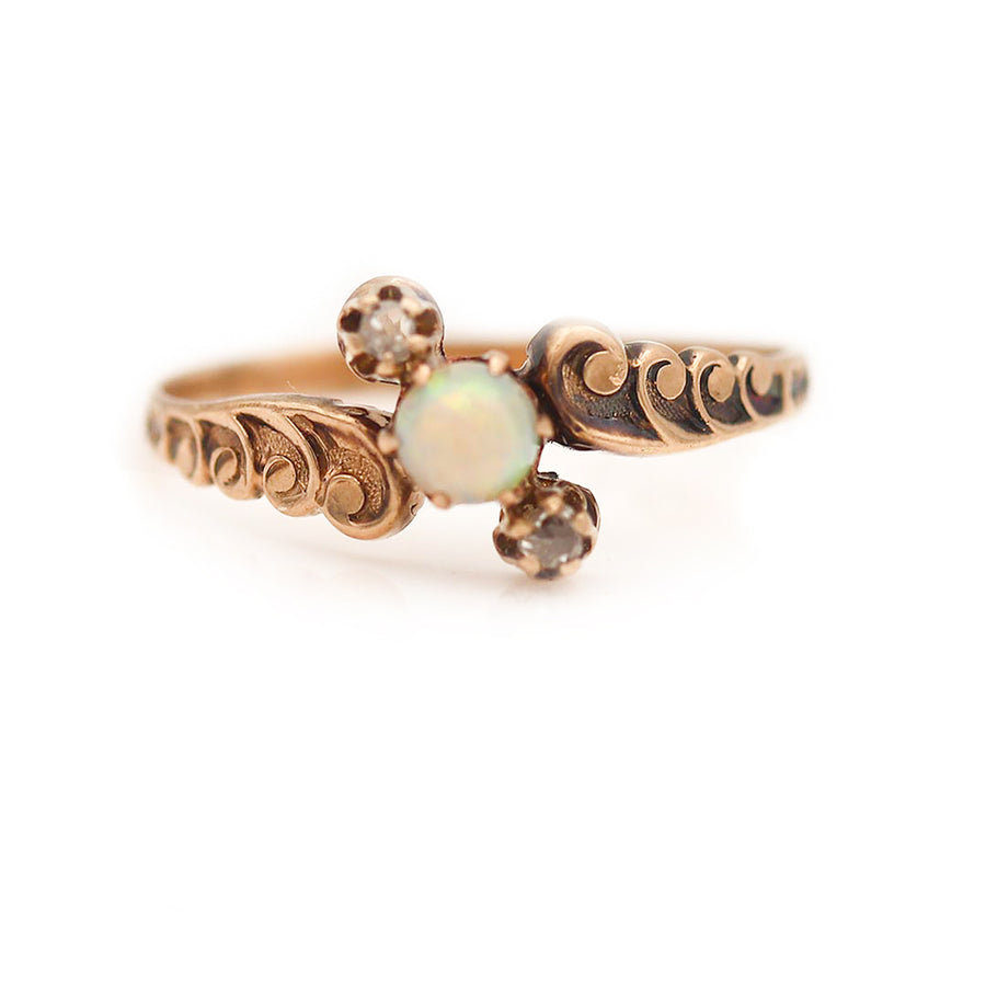 The Marks ring is an authentic vintage engagement ring from the Victorian era, circa 1900s. This ring features a center .35 cabochon opal surrounded by two north-south set rose cut diamond accents. Beautifully crafted in 10 kt rose gold, and accentuated with delicate filigree engravings, this ring is as sweet and delicate as can be. In good condition.