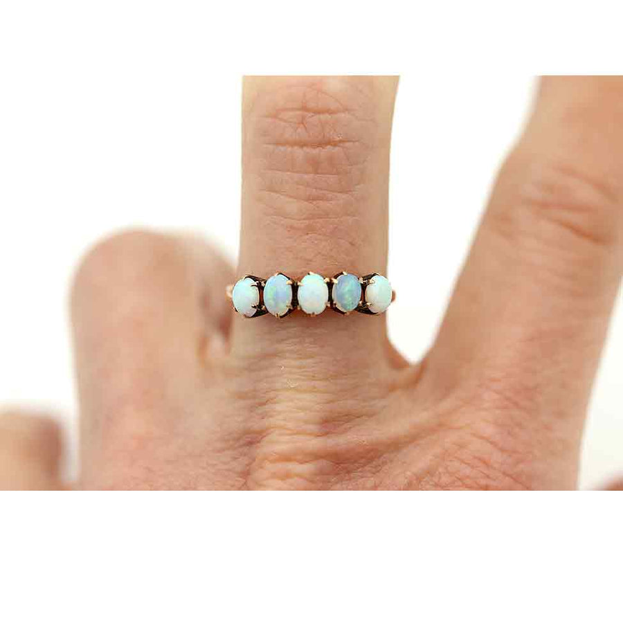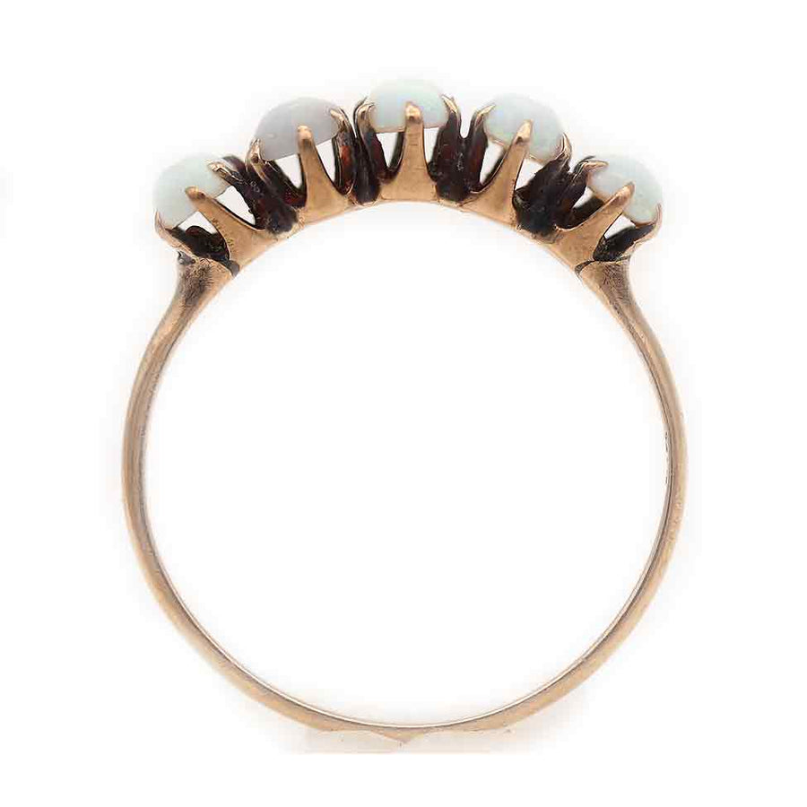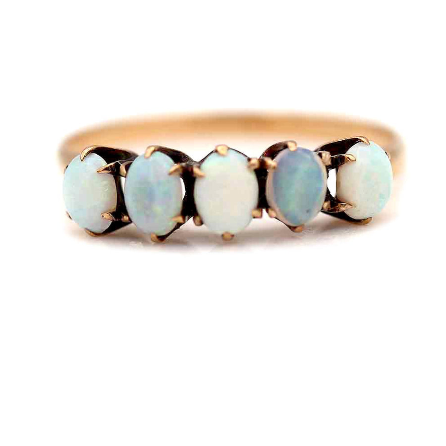 The Lully ring is an authentic Victorian wedding ring circa 1900s featuring five (5) vintage natural opals weighing approximately 1.50 ctw. Beautifully crafted in 10 kt rosy-yellow gold, this is a sweet, delicate Victorian gemstone ring. Perfect to wear alone or stack with other rings. In very good condition.