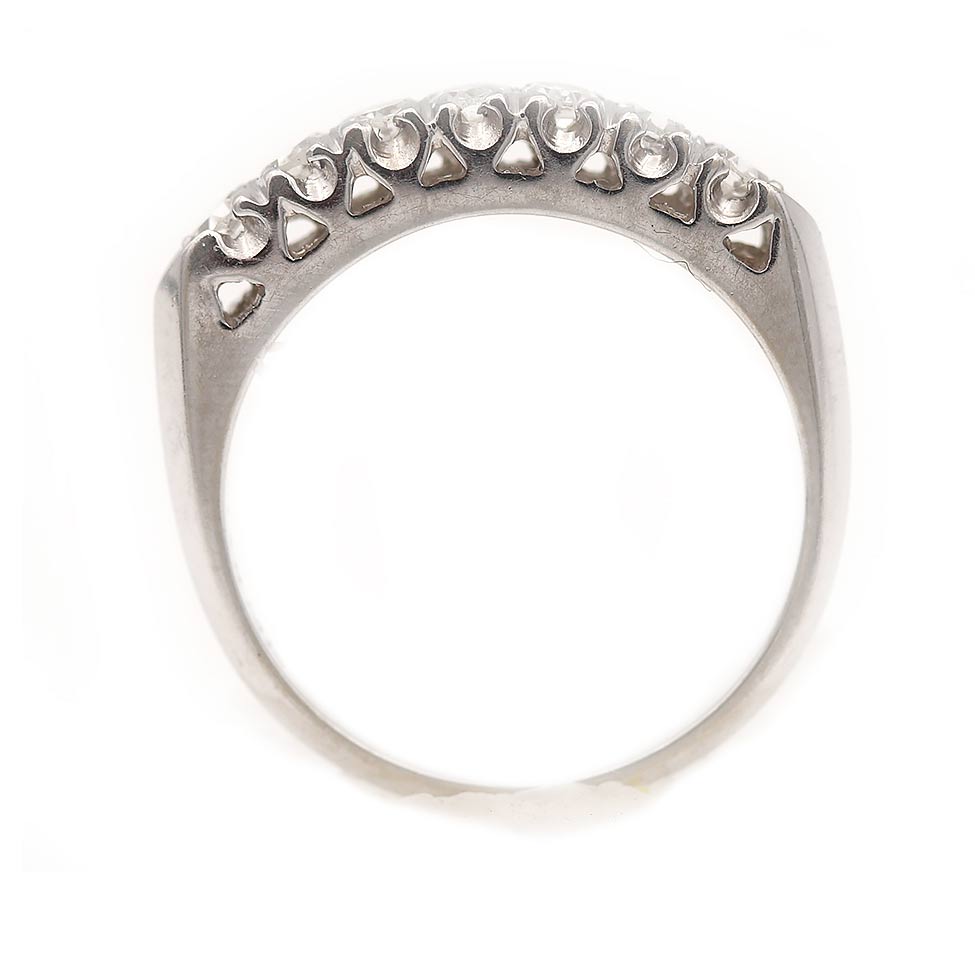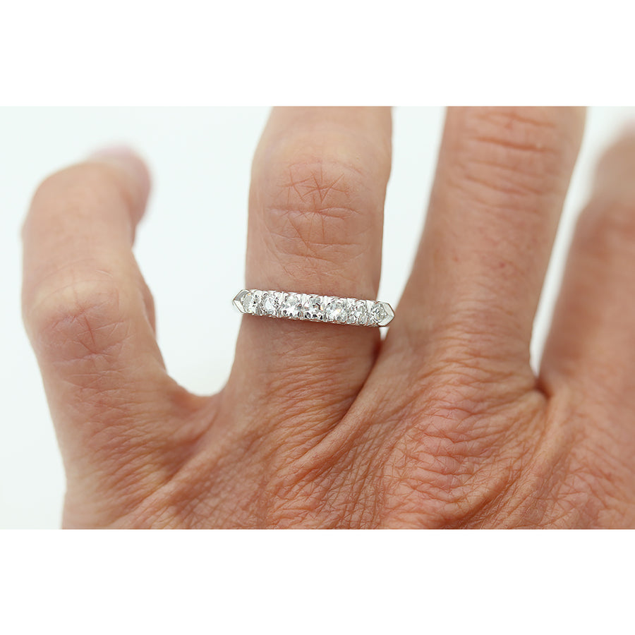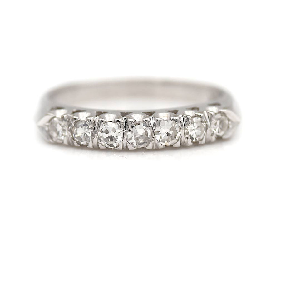 The Relata ring is a timeless antique wedding band, circa 1950's, featuring 7 bright-white single cut diamonds, weighing .42 carat with G color and VS2 clarity. Crafted in 14 kt white gold this is a perfect band to stack with other vintage wedding bands. In very good condition. The band measures 3.05 wide tapering to 2.88 and .08 at the bottom.