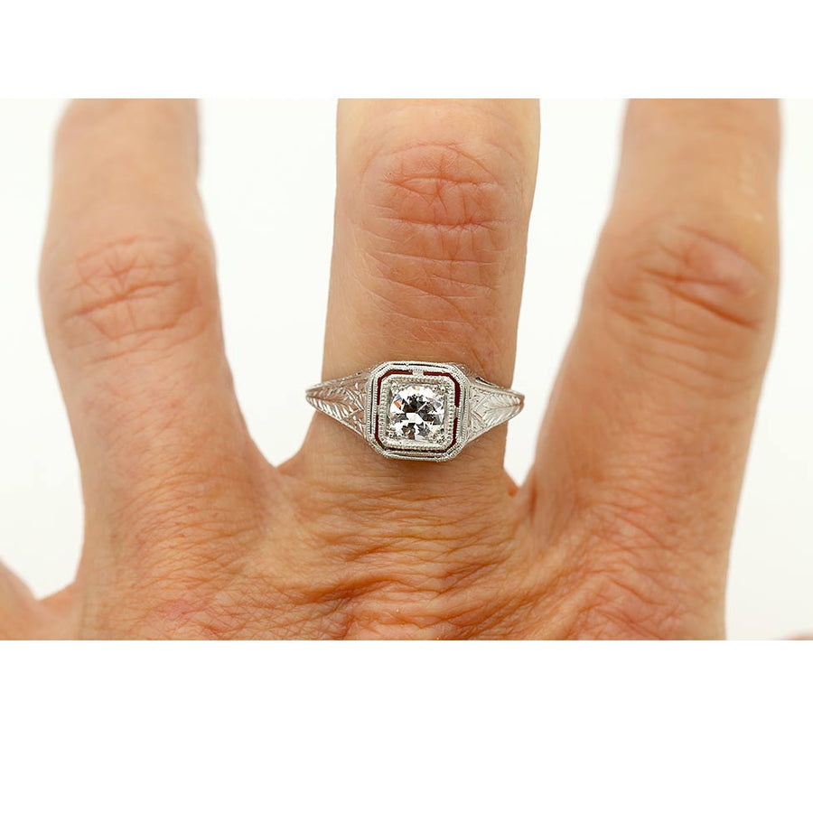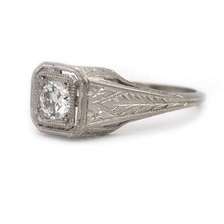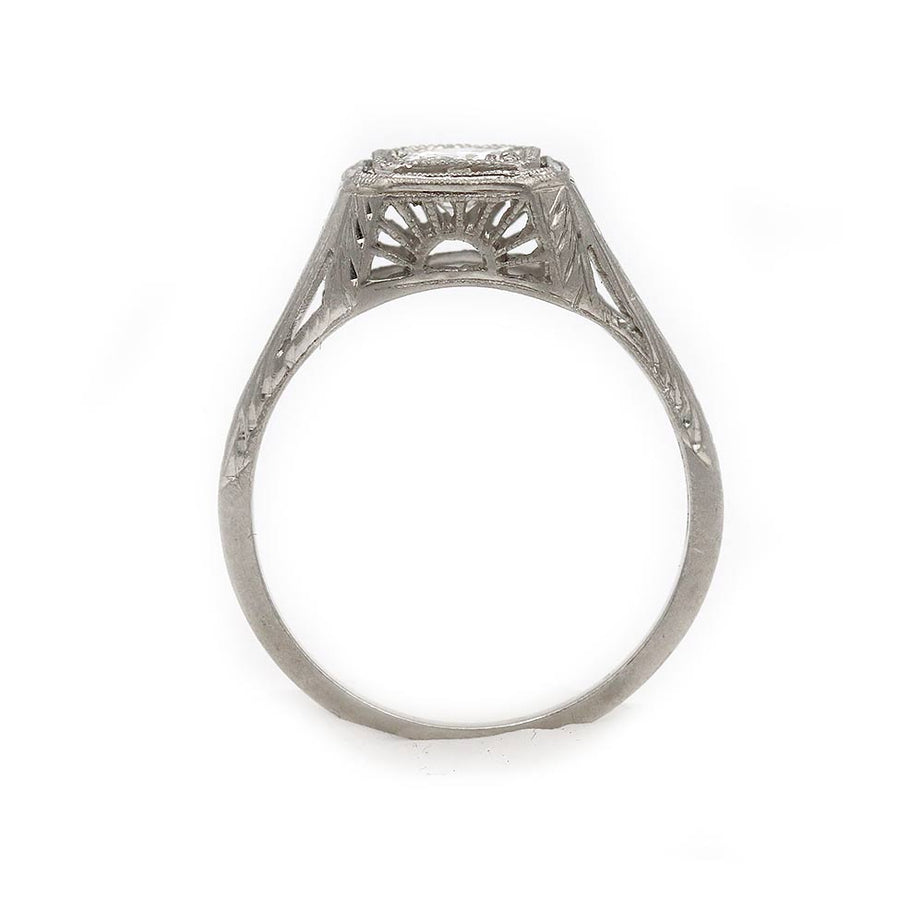The Dimitra ring is an authentic Art Deco engagement ring circa 1930's. The ring features an icy-white .35 carat old European cut diamond of F color, VS2 clarity, residing gracefully within a two tiered square milgrain frame. Beautifully crafted in platinum, accentuated with delicate open metal work and inticate filigree engravings. An rare, Art Deco treasure, in pristine condition.