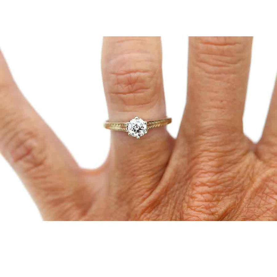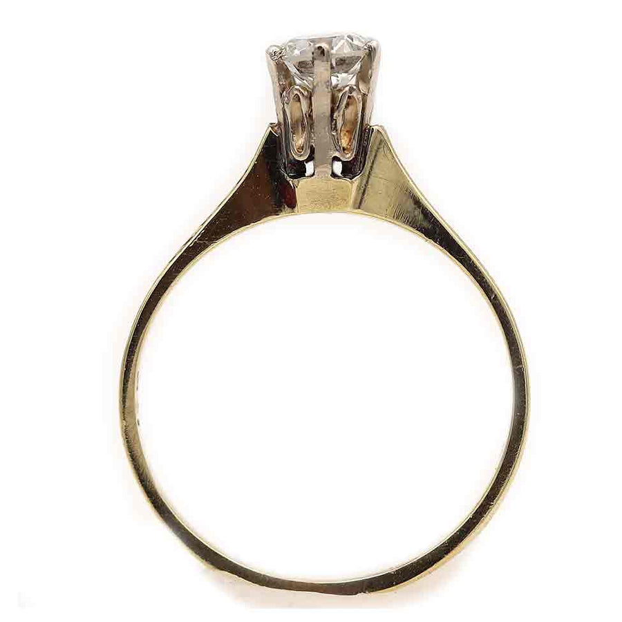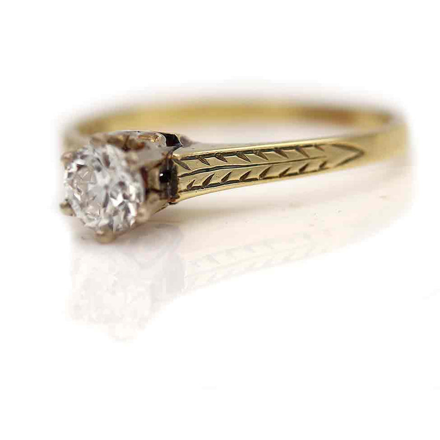 The K.D ring is an authentic antique engagement ring from the Art Deco era, circa 1940's. This ring features a glittering .41 carat GIA old European cut diamond of H color and SI2 clarity. The diamond stands tall and proud in a 14 kt yellow gold setting, accentuated with delicate filigree engravings. A sweet Art Deco ring, in very good condition.
