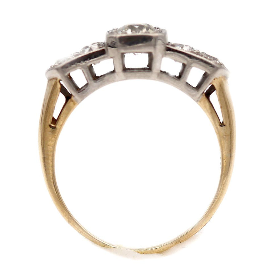 Take a trip back to the 1940s with the Letazia wedding ring. This authentic vintage wedding ring features an AGI certified .65 carat old mine cut diamond of H color and VS2 clarity, flanked by four (4) old mine cut diamonds weighing .50 carat, all H-I color and VS2 clarity. Beautifully crafted in 14 kt two tone gold. This is a perfect band to stack with other vintage bands or wear on either hand. In very good condition.