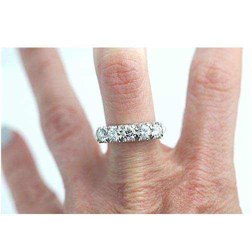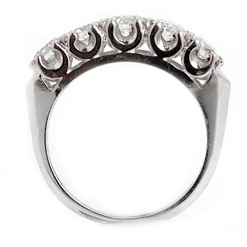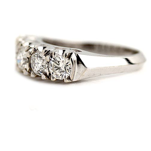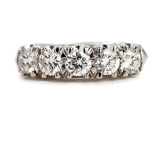 The Candida wedding band is an authentic vintage wedding band circa 1960s. The band features 5 sparkling transitional cut diamonds, weighing 1.50 carats (H color and VS2 clarity). Crafted in 14 karat white gold with knife edge prongs. Perfect to wear alone, as a complement with your vintage engagement ring or to stack with other bands! In excellent condition.