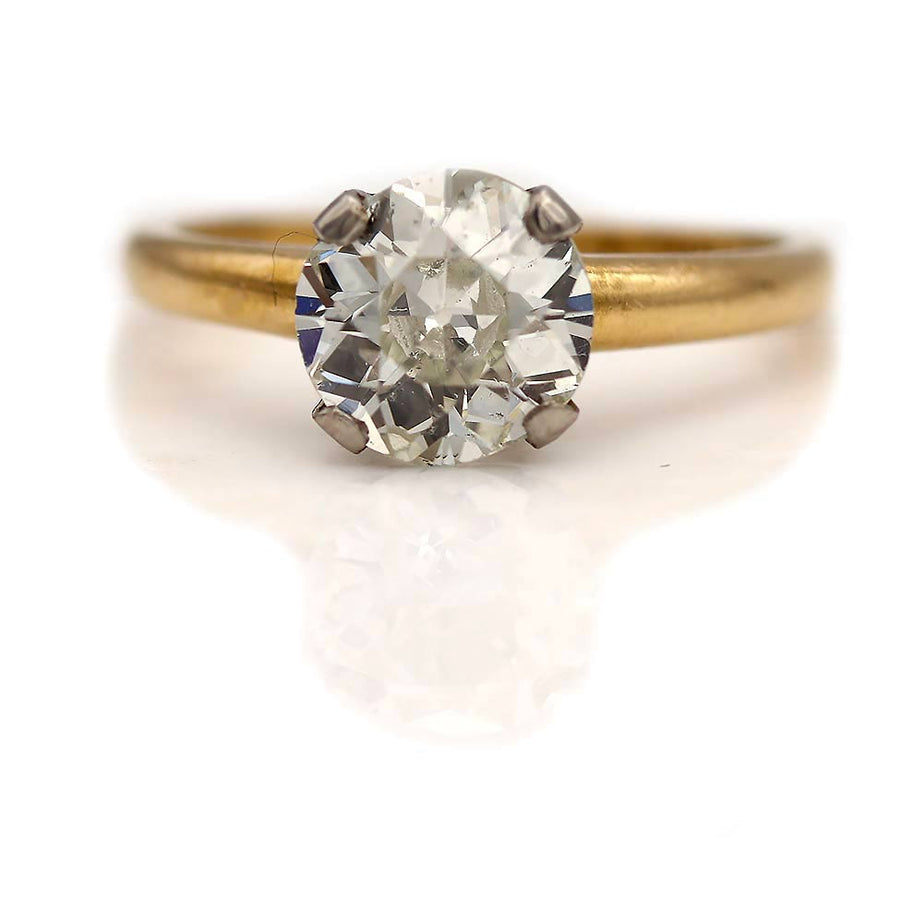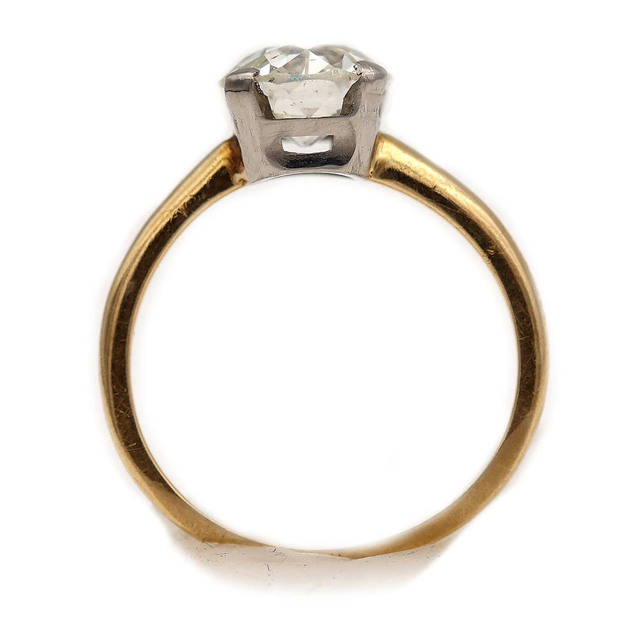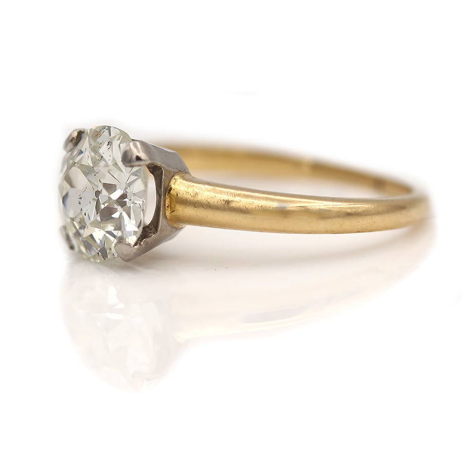 The Yardbird ring is an authentic vintage diamond engagement ring from the Art Deco era, circa late 1940s. This ring features a GIA certified 1.80 carat old mine cut diamond of K color and SI2 clarity. Beautifully crafted in gleaming 14 kt two tone gold, this is a lovely piece in good condition.