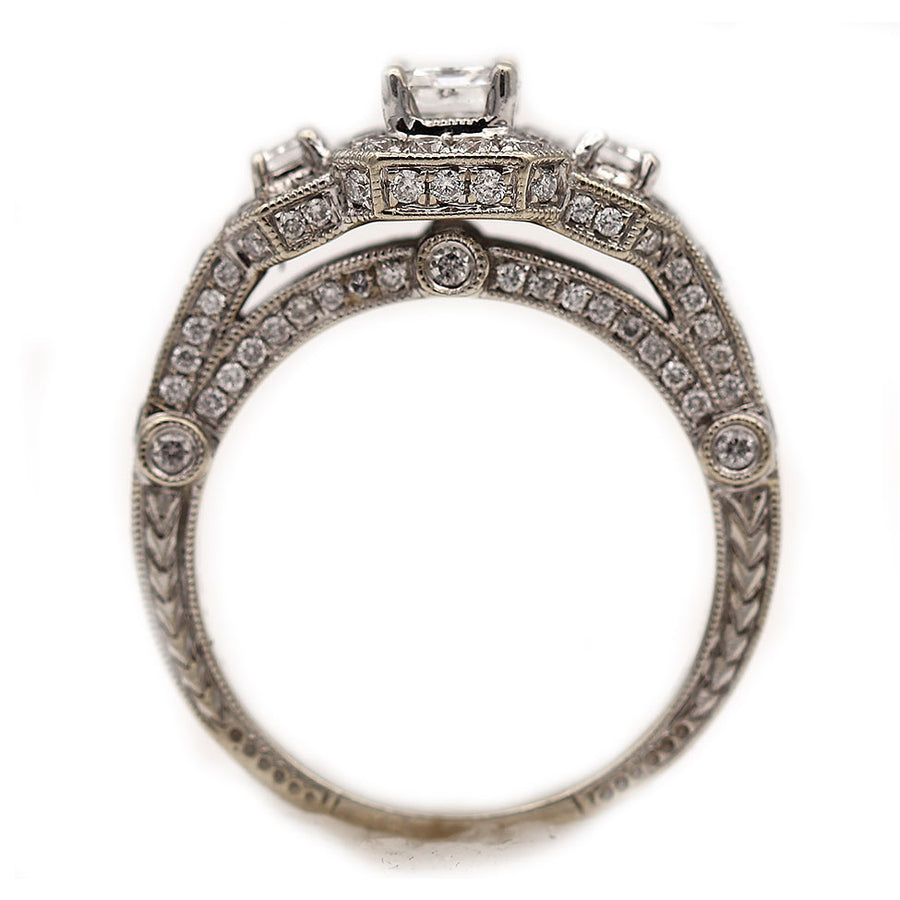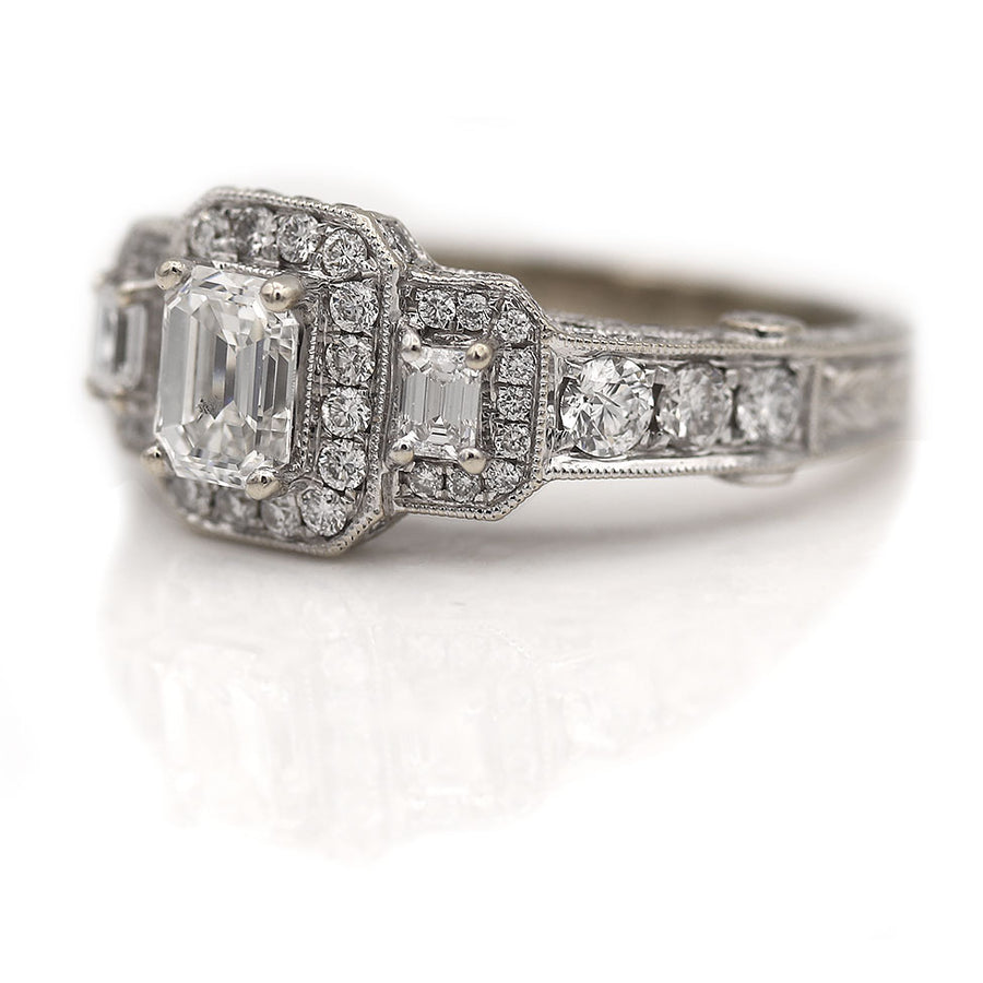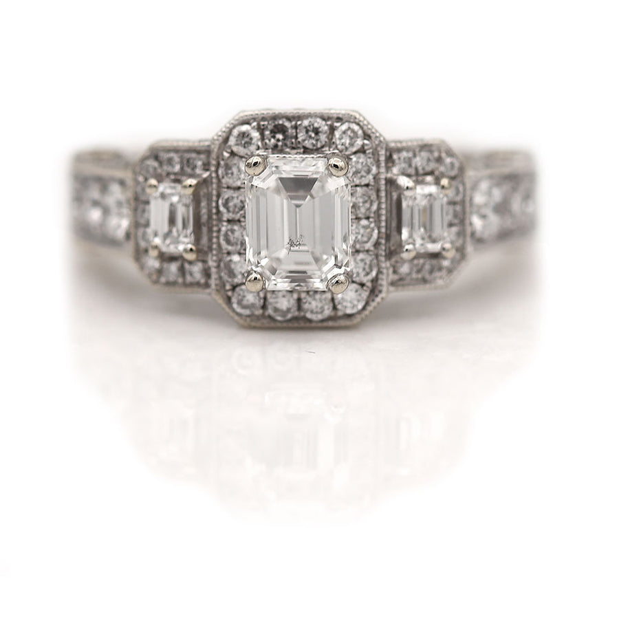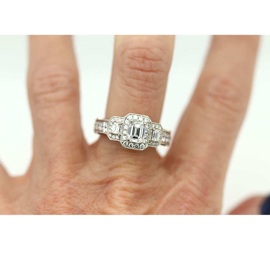The Alida ring is an authentic vintage engagement ring circa 1980's. The ring features a .75 carat AGI certified emerald cut of F color, SI2 clarity, residing within 4 delicate prongs. The diamond is flanked by 2 emerald cut diamonds and surrounded by a delicate halo of 16 round cut diamonds and 76 glittering round cut diamond accents. Beautifully crafted in 14 karat white gold, accentuated with micro-pave engravings. A magnificent ring, in pristine condition.