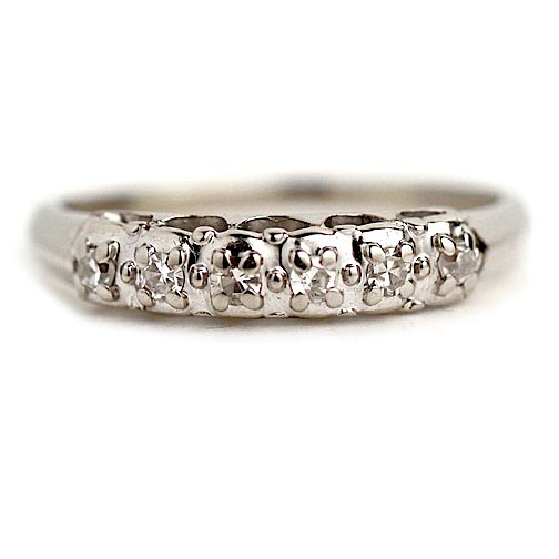 Luckie is a classic vintage wedding ring featuring five (5) prong set single cut diamonds, weighing .15 carat with G color and VS2-SI1 clarity. Beautifully crafted in the 1950's in 14 kt white gold, this is a classic band in very good condition. The band measures 3.3 wide tapering to 2.7 and 1.15 at the bottom. Size 6 and easily sized.