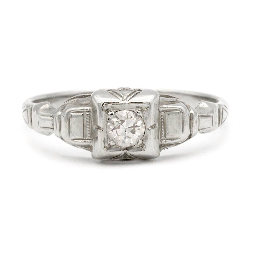 The Kaye ring is an authentic vintage engagement ring circa 1940s. The ring features a .15 carat old European cut diamond of J color, SI1 clarity, residing in a geometric square frame. Crafted in a 14 karat white gold setting, completed with filigree detailing. A unique and timeless ring, with beautiful engravings. In very good condition.