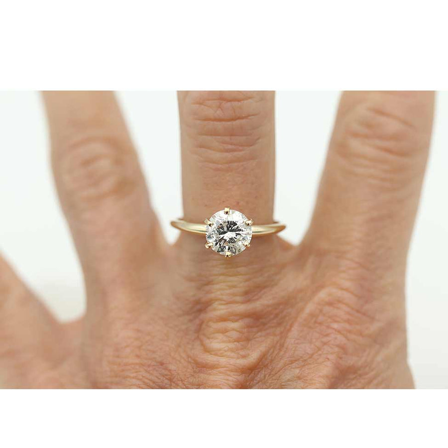 The Loesser ring is an authentic vintage diamond engagement ring, circa 1970s. The ring features a glittering 2.00 carat round diamond accompanied by a GIA report stating J color and I2 clarity (with a tiny laser). Crafted in 14 kt yellow gold six (6) prong setting. A classic and timeless solitaire ring.