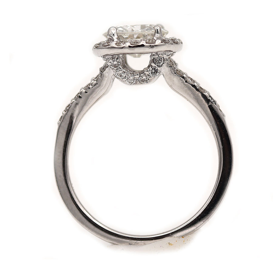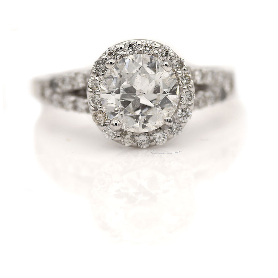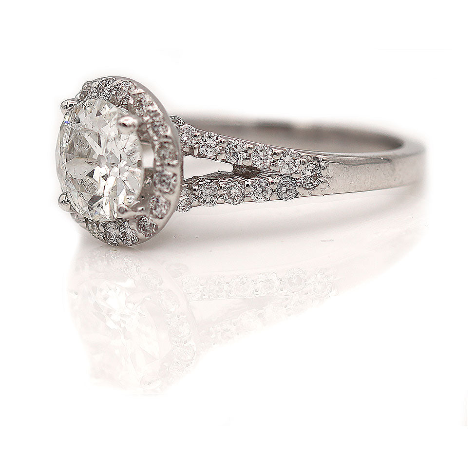 The Zeisel ring is an estate diamond engagement ring, circa 1980s. This vintage style ring features an authentic 1.32 carat old European cut diamond accompanied by an AGI certificate stating H color and I1 clarity. The diamond is surrounded by a delicate halo of 18 round cut diamonds weighing .40 carat, flanked by 22 round cut diamond accents, weighing .80 carat, residing within a sleek split shank. Crafted in 18 kt white gold, and accentuated with delicate milgrain engravings. A gorgeous estate ring, in very good condition.