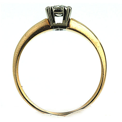 The Tandra ring is an authentic vintage engagement ring circa 1940s. The ring features a .30 carat old European cut diamond of G color, SI2 clarity, residing within fish tail prongs. This vintage diamond shines solo in gleaming 14 karat two-tone gold, white gold atop yellow gold. A timeless and classic 1940's piece, with the perfect amount of patina. In very good condition.