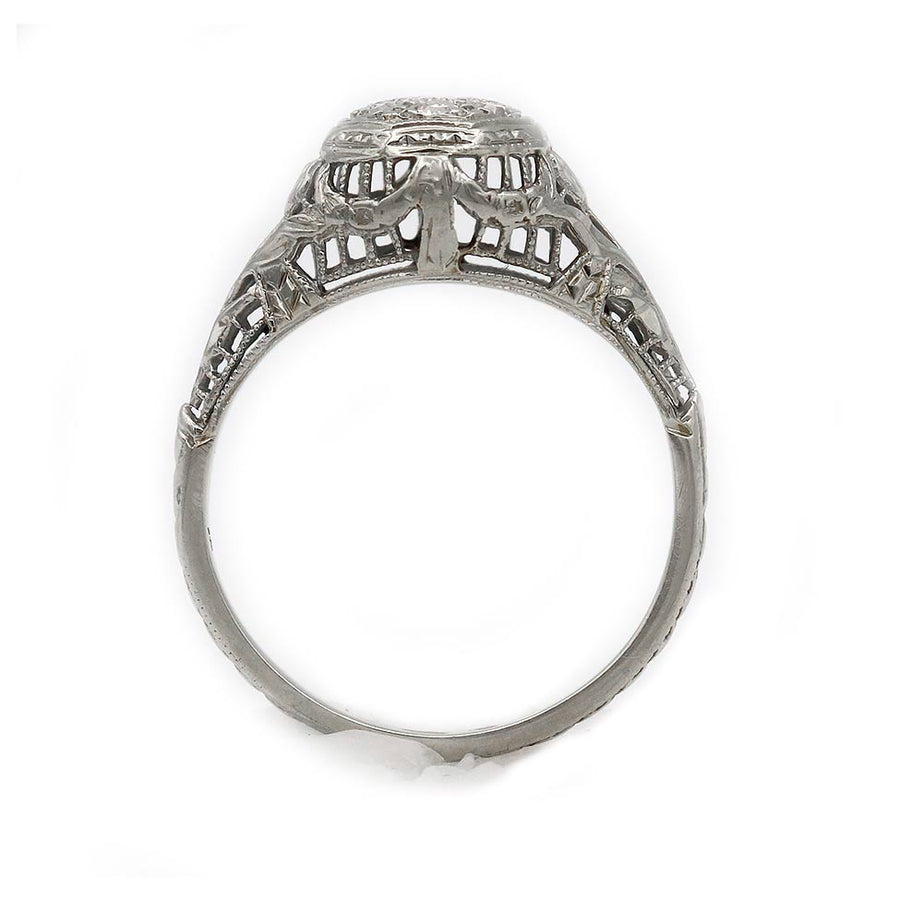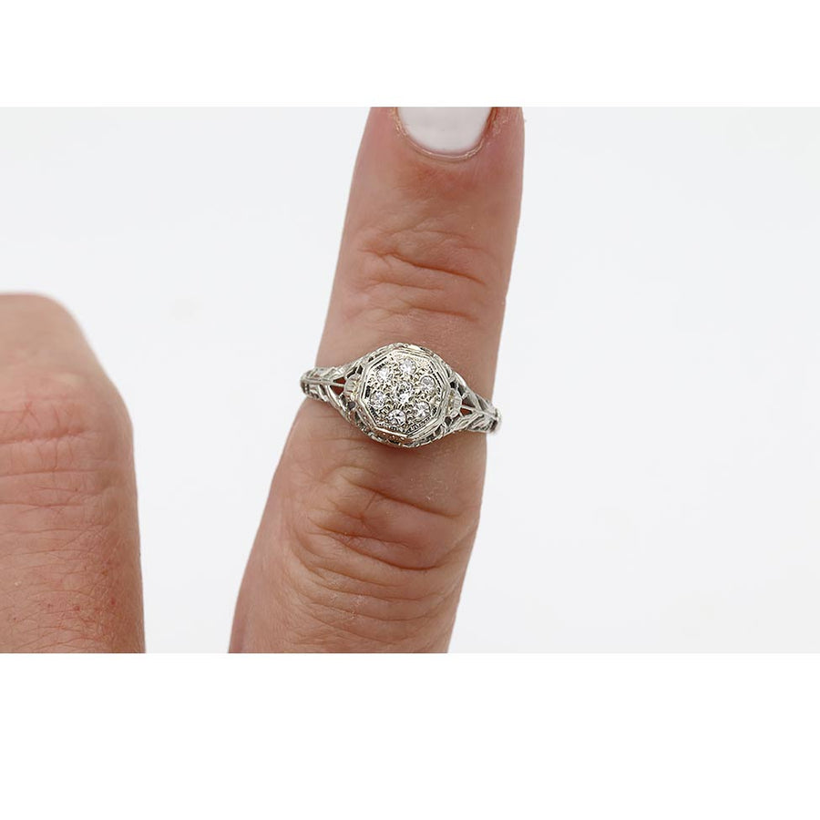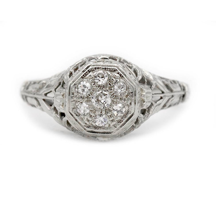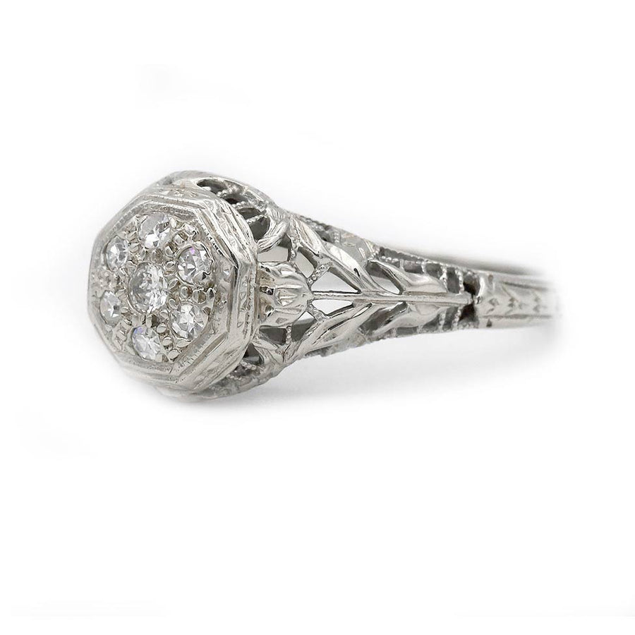 The Una ring is an authentic vintage cluster engagement ring from the Art Deco era circa 1940's. This white gold cluster engagement ring features 7 glittering old European cut diamonds weighing .30 carat of F color, VS2 clarity. Crafted in 14 karat white gold, accentuated with open metal work and filigree engravings. Chic, sophisticated and in good condition. Perfect to wear on either hand!