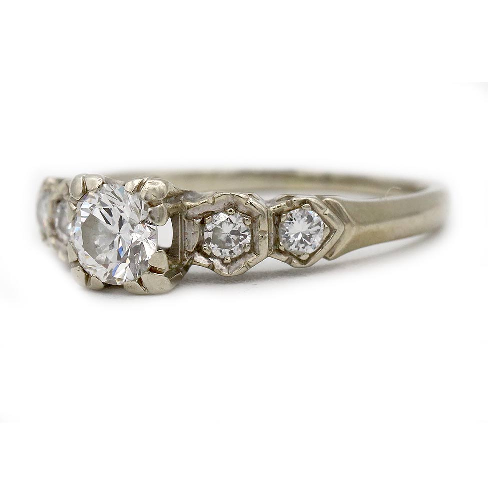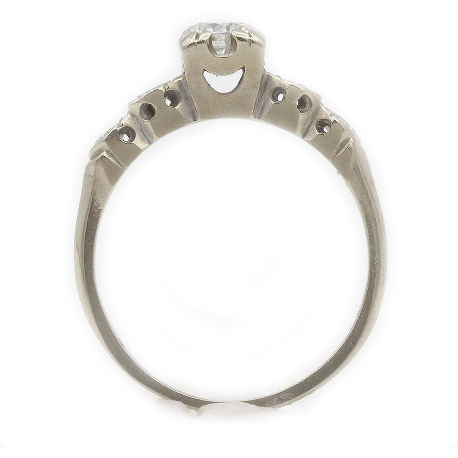 The Sherrie ring is an authentic vintage engagement ring circa 1940s. The ring showcases a bright-white .40 carat old transitional cut diamond of G color, SI2 clarity, residing within trefoil prongs. The diamond is flanked 4 dazzling transitional cut diamond accents. Crafted in 14 karat white gold. A sleek, elegant ring that is perfect to wear on either hand! In very good condition.