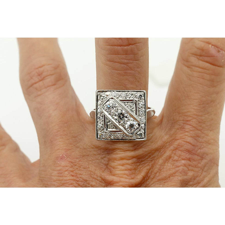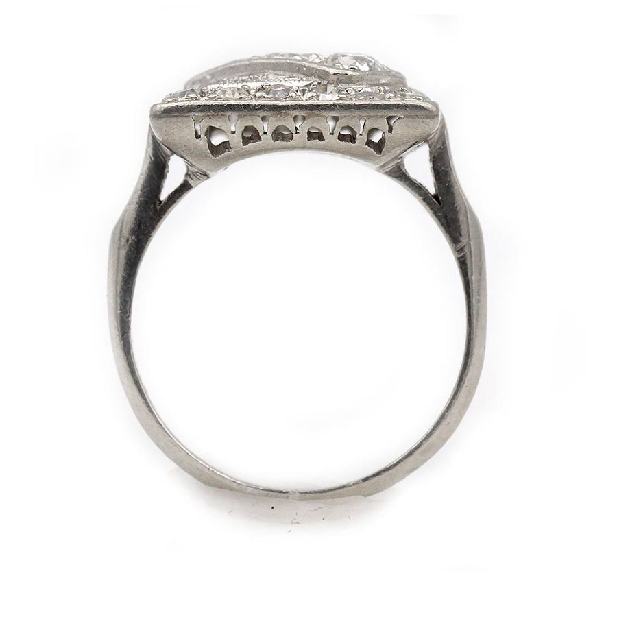 The Violeta ring is an authentic vintage cocktail ring circa 1960s. This Unique Vintage Diamond Square Cocktail ring, centers a trio of dazzling asymmetrically set old European cut diamonds, of F color, VS2 clarity. The diamonds are surrounded by delicate halo of 17 old mine and single cut diamonds accents. Crafted in platinum, accentuated with milgrain engravings. A vintage stunner that will spread the finger beautifully. Perfect to wear on either hand. In very good condition. Length 1/2 " by 1/2".