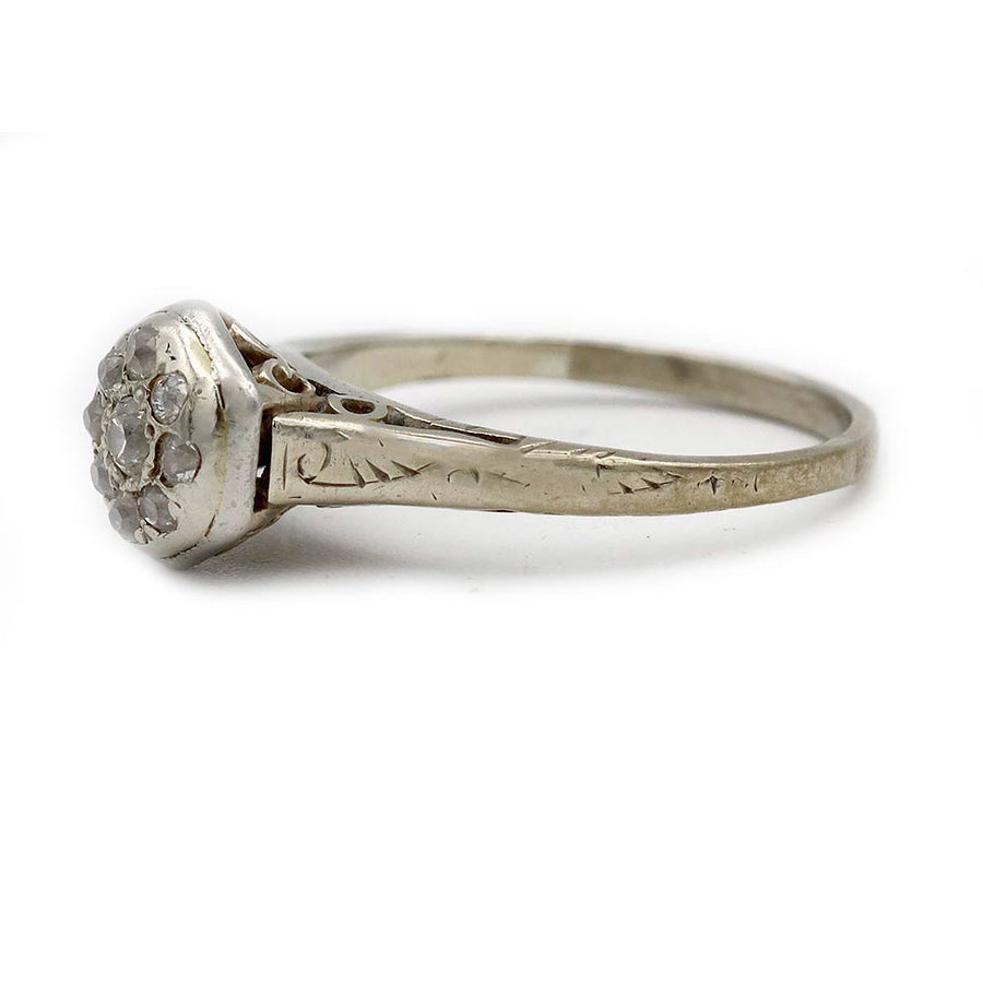 The C J ring is an authentic vintage cluster ring circa 1950s. The ring showcases 9 petite old mine cut diamonds weighing approximately .30 carat of H color, SI1 clarity. Crafted in 14 karat white gold, completed with a beautiful open metal work gallery. Perfect to wear on either hand, in good condition.