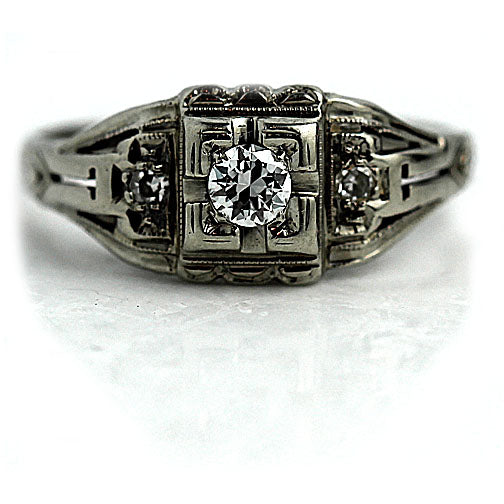 This very art Deco engagement ring contains 1 vintage Old European cut diamond, weighing appx 0.20 carats. Crafted in an 18 kt antique square geometric mounting, this vintage diamond is flanked by 2 single cut diamonds. Please notice the fantastic antique mil grain design work. Size 4 1/2 and easily sized. AD# 4OSBX 4 $1250.00