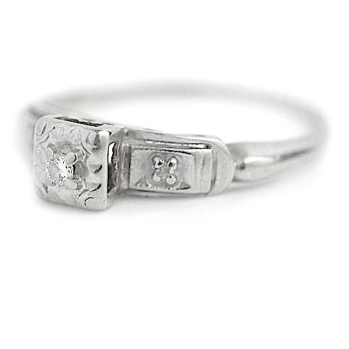 The Richelle ring is an authentic antique promise ring circa 1940's. The ring features a .05 carat transitional-cut diamond of F color, VS2 clarity, flanked by 2 rose cut diamond accents. Crafted in 14 karat white gold, accentuated with delicate engravings. A delicate promise ring, with the perfect amount of patina. In very good condition. For the matching band (ad1731hce1).