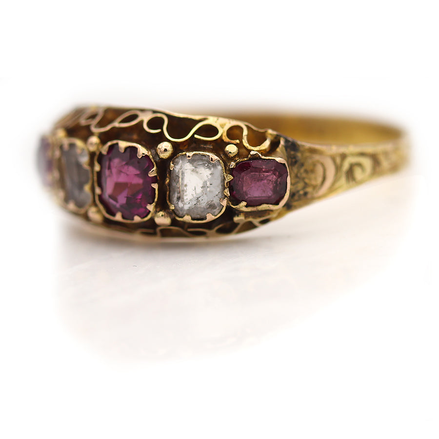 The Mele ring is an authentic vintage wedding ring from the Victorian era, circa 1900's. This ring features three (3) natural deep purple cushion cut almandine garnets and two (2) natural white cushion cut Aquamarines. Beautifully crafted in an original 15 kt yellow gold Victorian setting, this ring is perfect to wear alone or stack with other vintage rings. In very good condition.