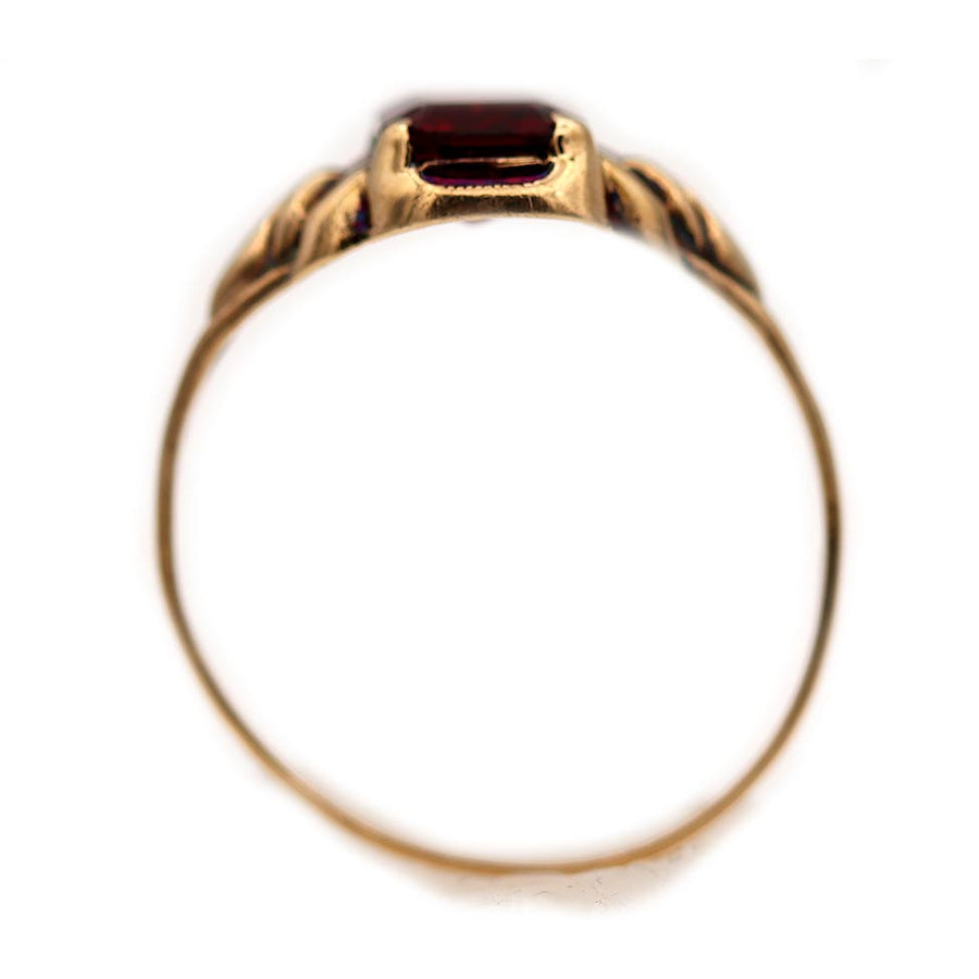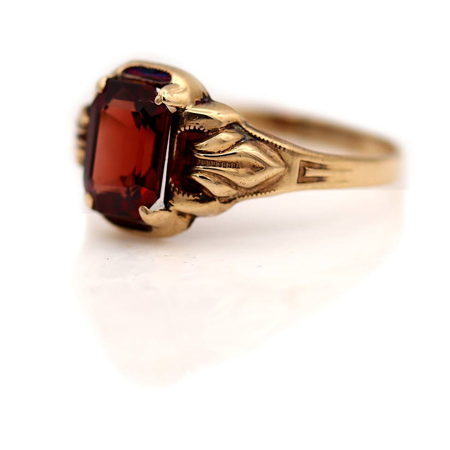 The Sye ring is an authentic Victorian garnet ring, circa 1900s. The ring features a natural vintage emerald cut garnet weighing 1.00 carat. Beautifully crafted in 10 kt rosy-yellow gold, and accentuated with delicate filigree and milgrain engravings. This vintage garnet ring embodies timeless elegance. In very good condition.
