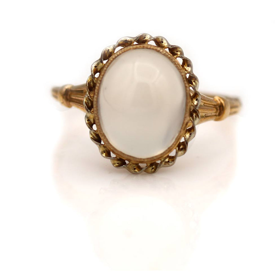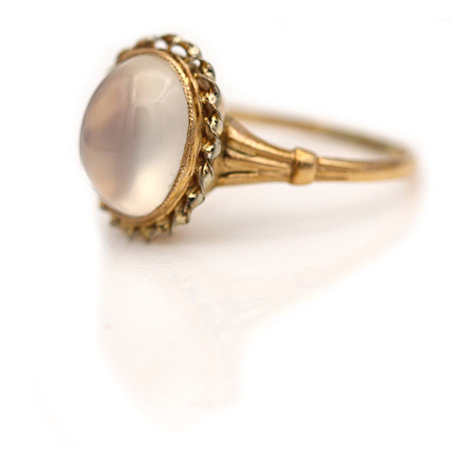 The Fain Ring is a beautiful vintage gemstone engagement ring from the Victorian era, circa early 1900s. This ring features a natural, bezel-set cabochon moonstone of about 2.50 carats, set in 10k yellow gold. The band is accentuated with delicate milgrain and filigree engravings, adding unique character to this bold piece. A standout gemstone ring that looks stunning on either hand, it’s in very good condition and ready to become a treasured part of your collection.
