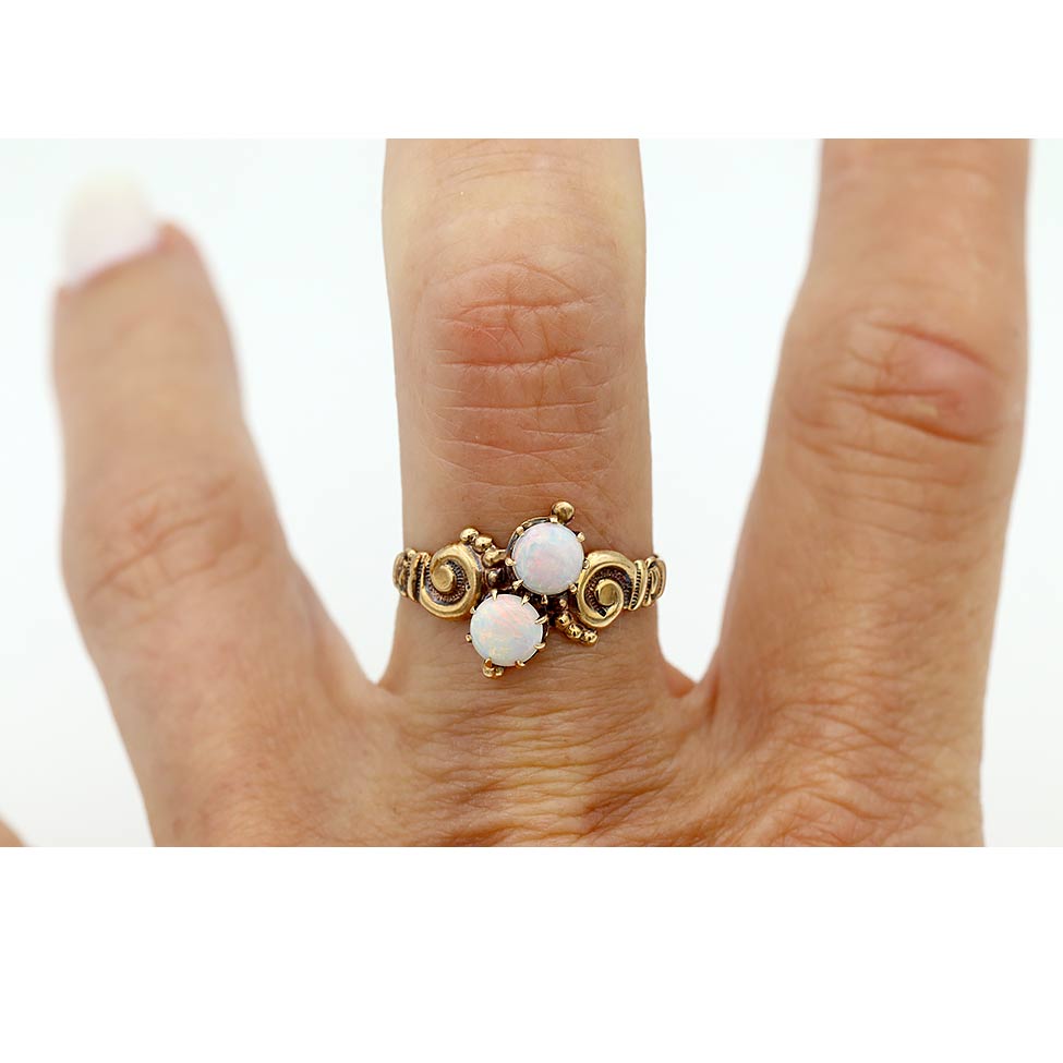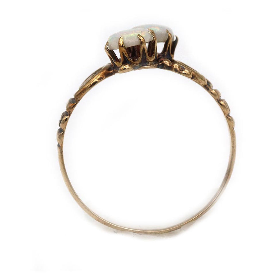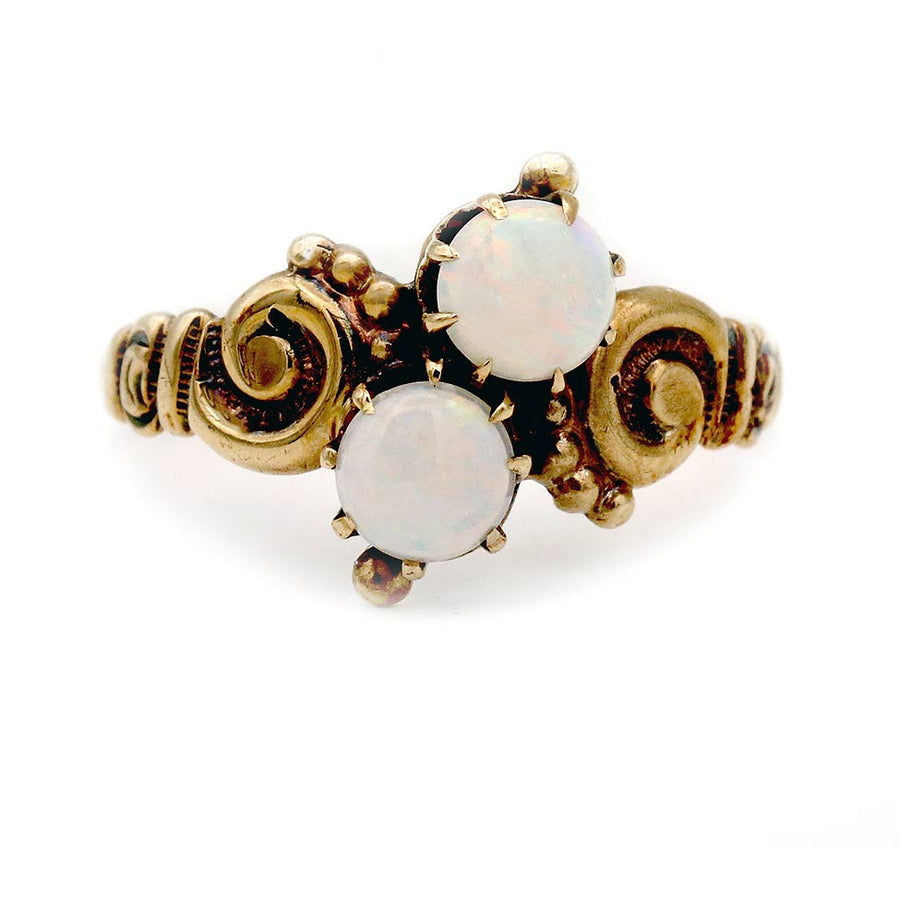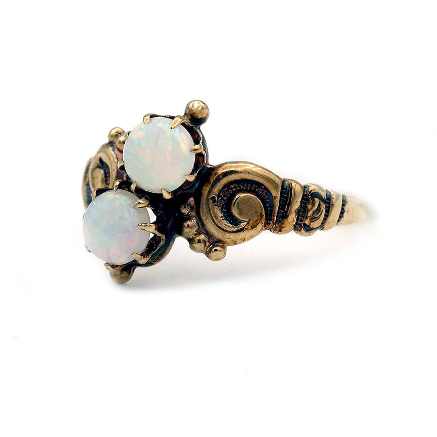 The Claudette ring is an authentic Victorian engagement ring, circa 1900s, featuring two (2) natural cabochon opals. Beautifully crafted in 10 kt rosy-yellow gold, and accentuated with delicate filigree engravings, this ring is in very good condition and is as sweet as can be!