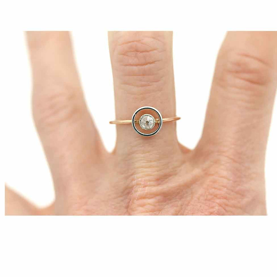 The Wiltoney ring is an authentic estate diamond engagement ring, circa 1900s, featuring a bezel set .25 rose cut diamond residing in a delicate halo. Crafted in 14 kt two tone gold, this is a sweet dainty piece. In good condition.