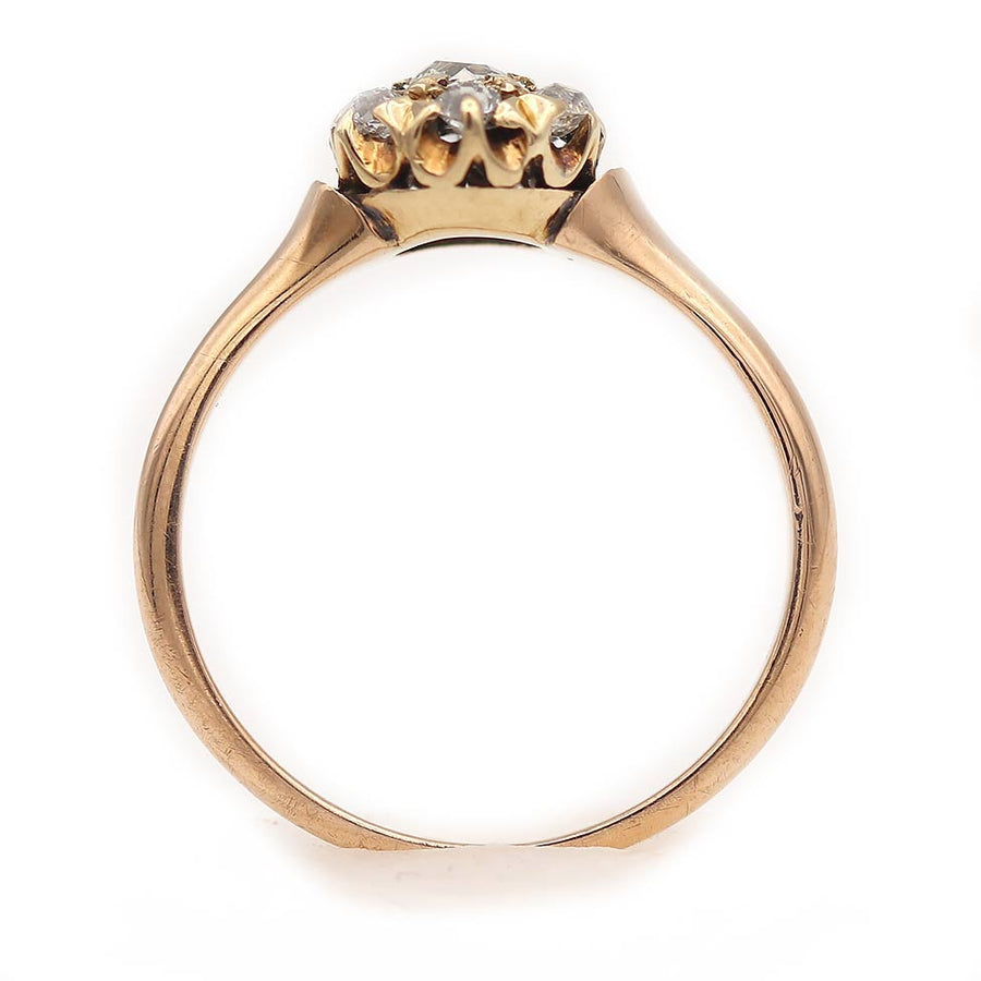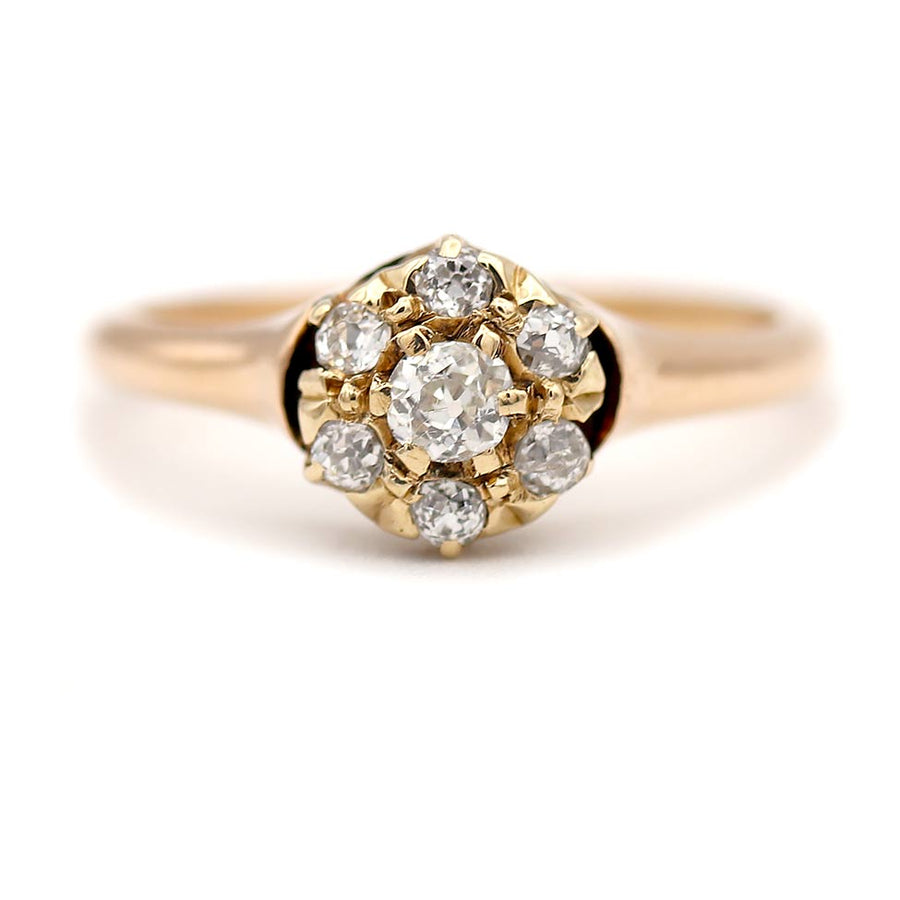 The Favorite ring is an authentic Victorian halo engagement ring, circa 1900s. This ring features a distinctive .15 carat mine cut diamond surrounded by a halo of 6 mine cut diamonds weighing .20 carat. Beautifully crafted in 10 kt rosy-yellow gold. As sweet as can be!