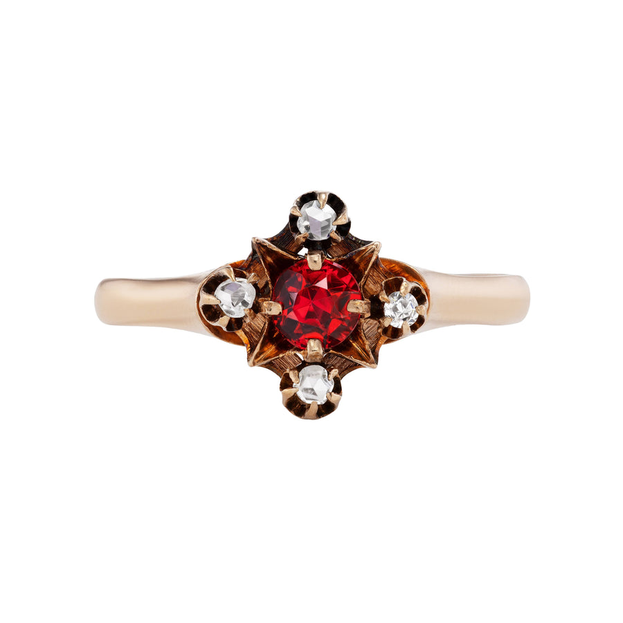 Victorian .55 CTW Red Spinel Engagement Ring Rose Cut Diamonds 10K Rosy Yellow Gold