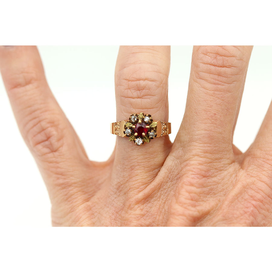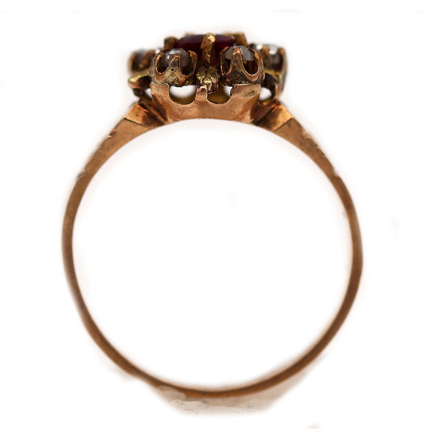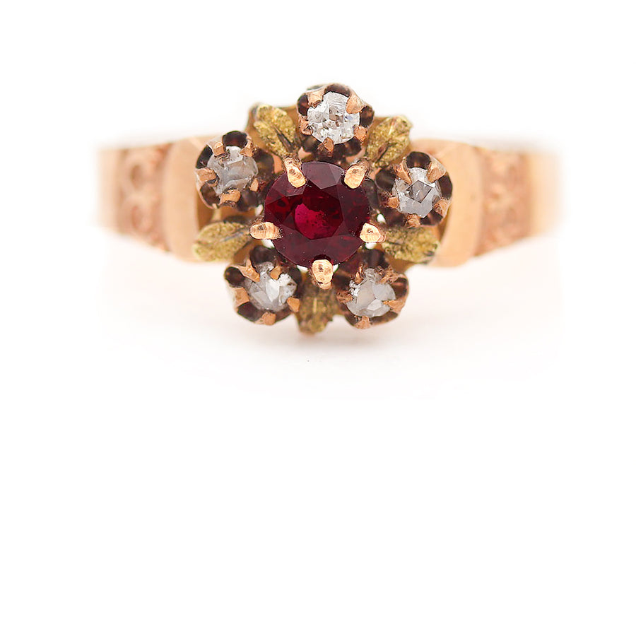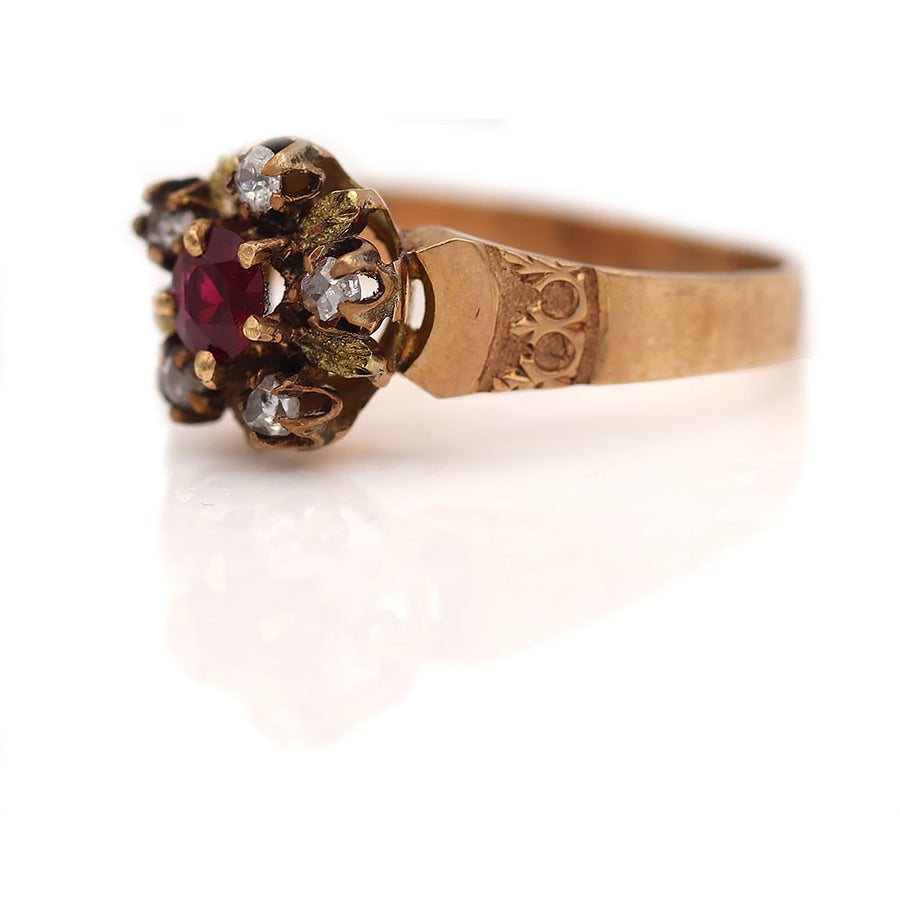 The Maya ring is an authentic Victorian engagement ring circa late 1800's. The ring features a natural .35 carat round cut Burmese ruby. This vibrant ruby is surrounded by a delicate halo of 5 old rose cut diamond accents. Crafted in gleaming 14 karat rose gold, accentuated with intricate filigree detailing. A rare, ravishing ring featuring a pigeon blood Burma ruby. In very good condition.