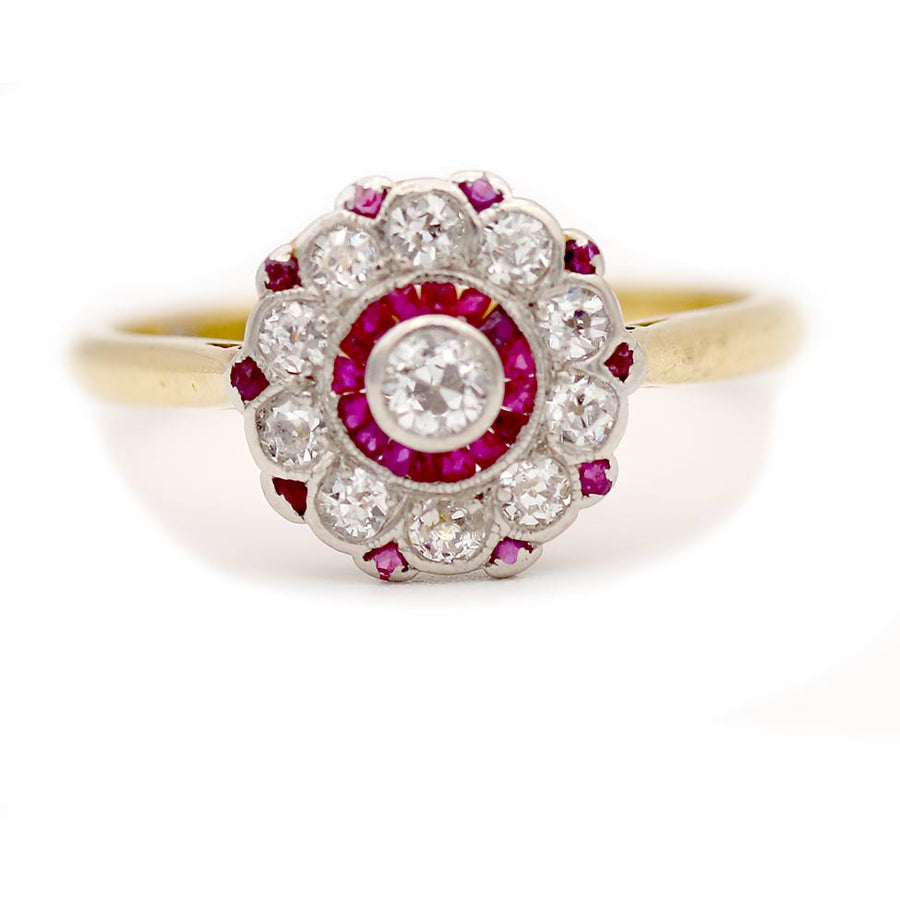 The Whisper ring is an authentic Victorian ruby engagement ring, circa 1900s. This ring features a bright-white .40 ct mine cut diamond, surrounded by a delicate halo of ten (10) mine cut diamonds and 26 natural square and round cut Burma rubies. Beautifully crafted in platinum and 18 kt yellow gold. A beautiful Victorian ring, very hard to find. In good condition.