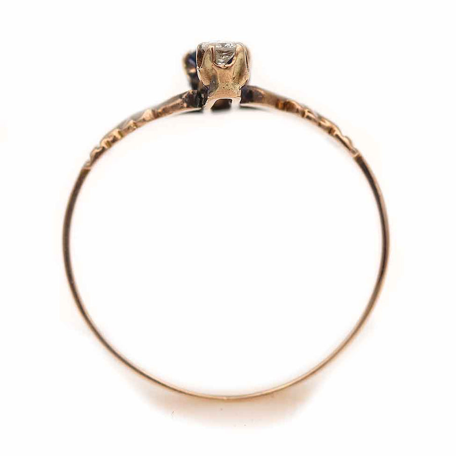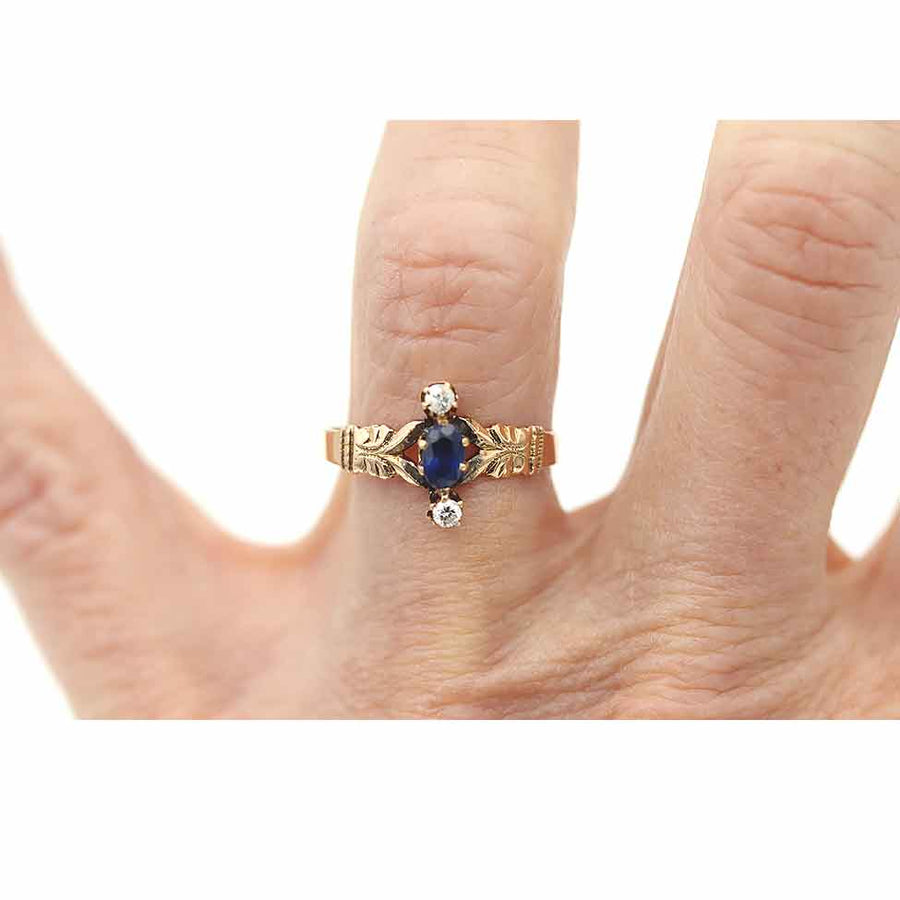 The Dennis ring is an authentic vintage engagement ring from the Victorian era, circa 1900s. This ring features a .30 carat natural vintage oval cut Ceylon sapphire, flanked by two (2) north-south old mine cut diamonds. Beautifully crafted in a 10 kt rosy-yellow gold setting, and accentuated with filigree engravings. A sweet Victorian sapphire ring, in very good condition.
