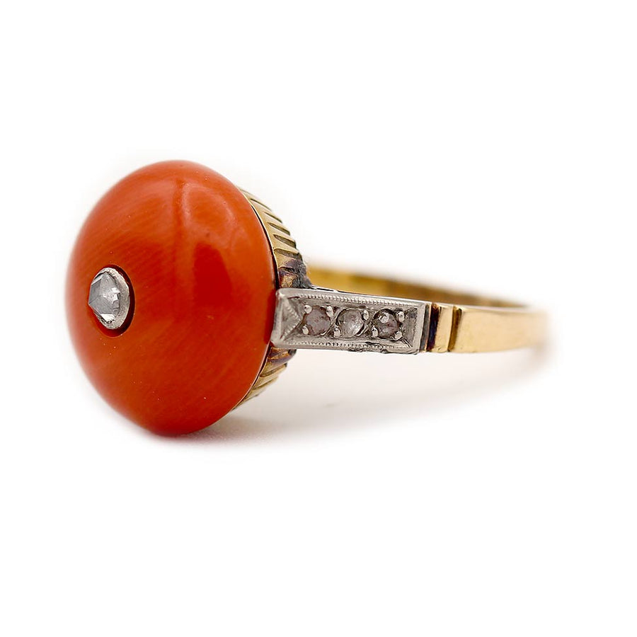 The Fain ring is an authentic Victorian coral engagement ring circa 1900's. This ring features a deep orange-salmon cabochon coral centered by a dainty vintage rose cut diamond, and is flanked by six rose cut diamond accents. Beautifully crafted in 18 kt two-tone gold and accentuated with delicate milgrain and filigree engravings. In very good condition.