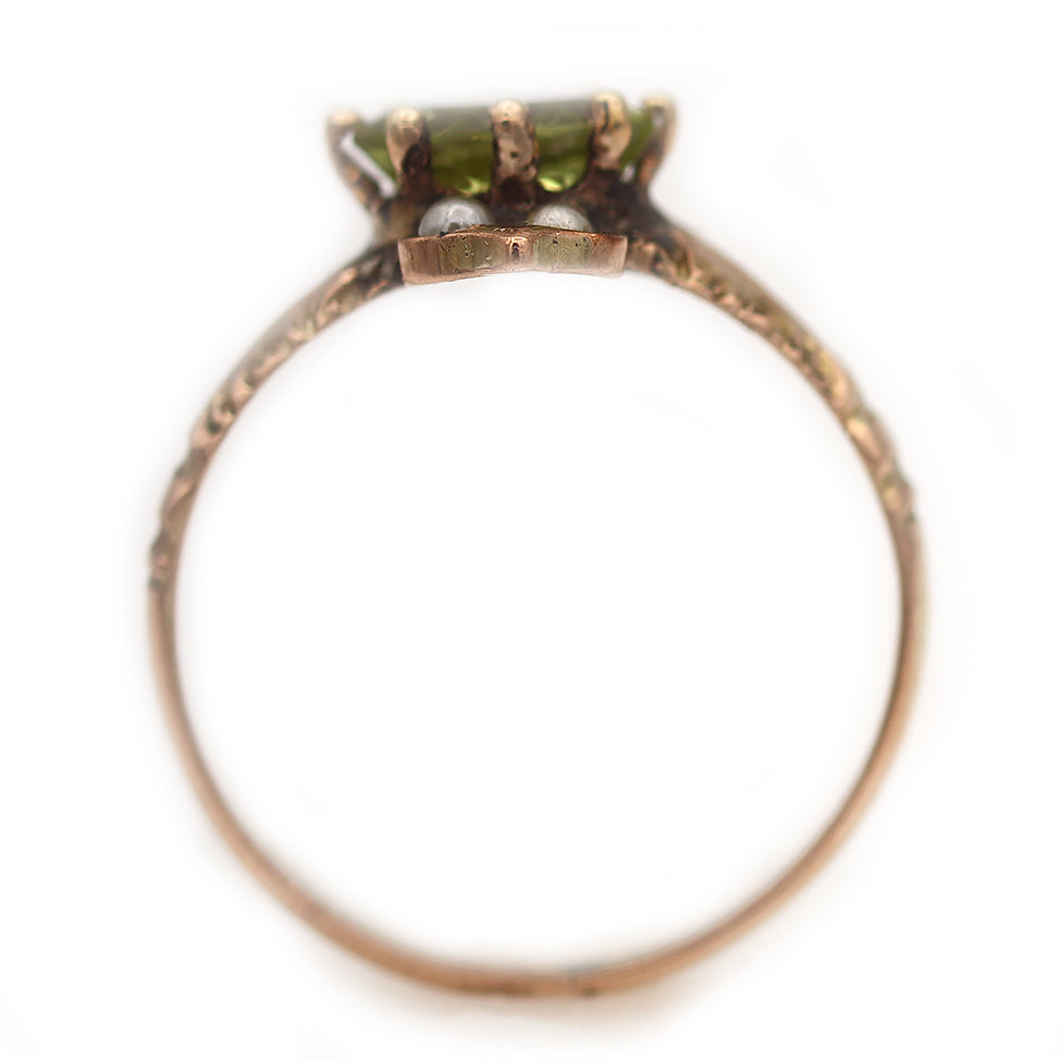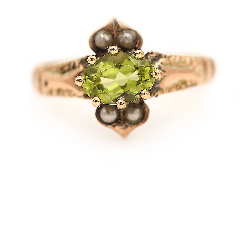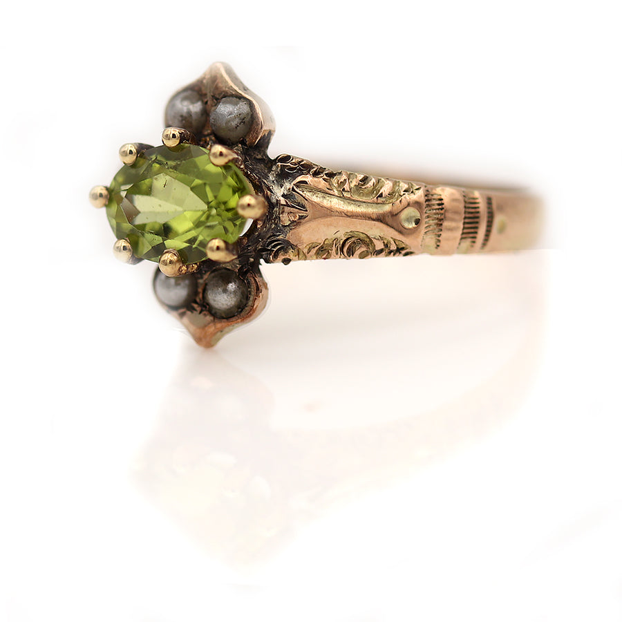 Victorian East-West Oval Peridot and Seed Pearl Engagement Ring Circa 1900's