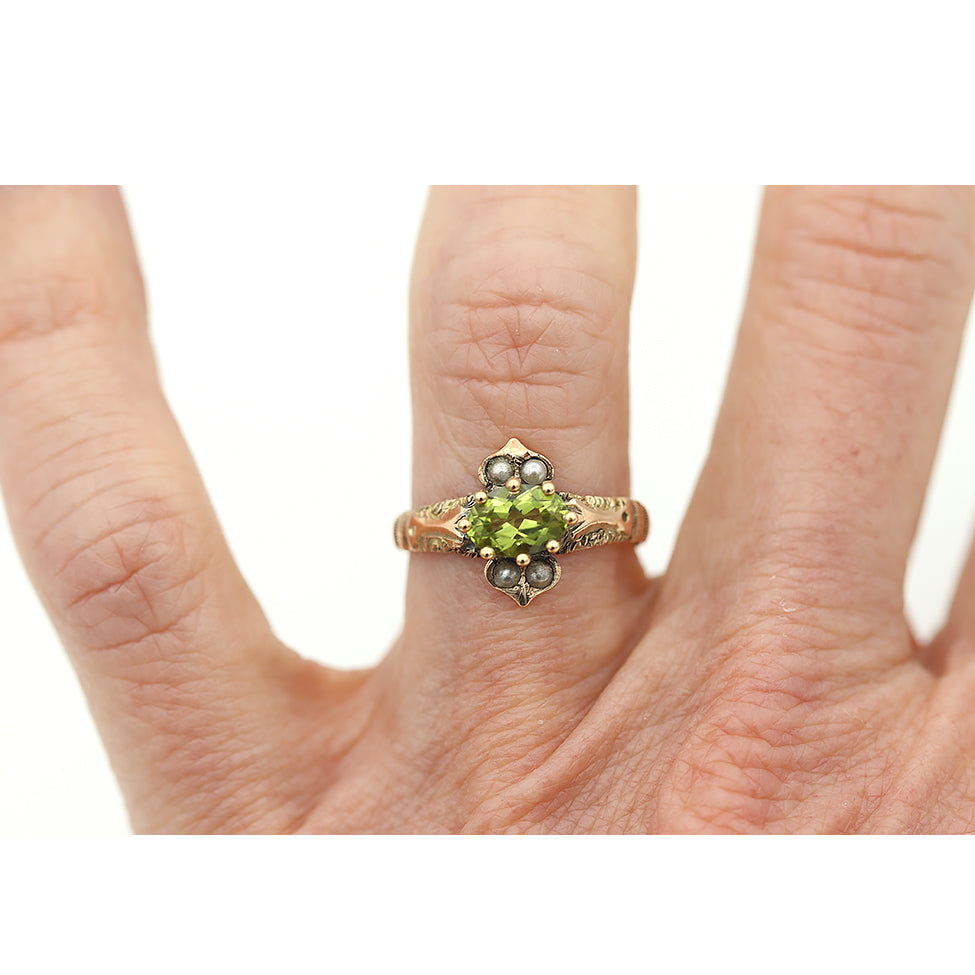 The Mann ring is an authentic vintage peridot engagement ring from the Victorian era, circa 1900's. This ring features a natural, intense green, East-West set 1.00 carat oval cut peridot surrounded by four (4) seed pearls. Beautifully crafted in 10 kt rosy-yellow gold, and accentuated with filigree engravings, this gemstone ring is as sweet as can be. In very good condition.